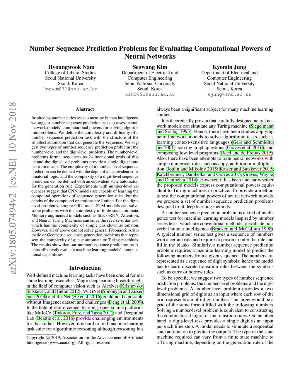 Inspired by number series tests to measure human intelligence, we suggest number sequence prediction tasks to assess neural network models' computational powers for solving algorithmic problems. We define the complexity and difficulty of a number sequence prediction task with the structure of the smallest automaton that can generate the sequence. We suggest two types of number sequence prediction problems: the number-level and the digit-level problems. The number-level problems format sequences as 2-dimensional grids of digits and the digit-level problems provide a single digit input per a time step. The complexity of a number-level sequence prediction can be defined with the depth of an equivalent combinatorial logic, and the complexity of a digit-level sequence prediction can be defined with an equivalent state automaton for the generation rule. Experiments with number-level sequences suggest that CNN models are capable of learning the compound operations of sequence generation rules, but the depths of the compound operations are limited. For the digit-level problems, simple GRU and LSTM models can solve some problems with the complexity of finite state automata. Memory augmented models such as Stack-RNN, Attention, and Neural Turing Machines can solve the reverse-order task which has the complexity of simple pushdown automaton. However, all of above cannot solve general Fibonacci, Arithmetic or Geometric sequence generation problems that represent the complexity of queue automata or Turing machines. The results show that our number sequence prediction problems effectively evaluate machine learning models' computational capabilities.