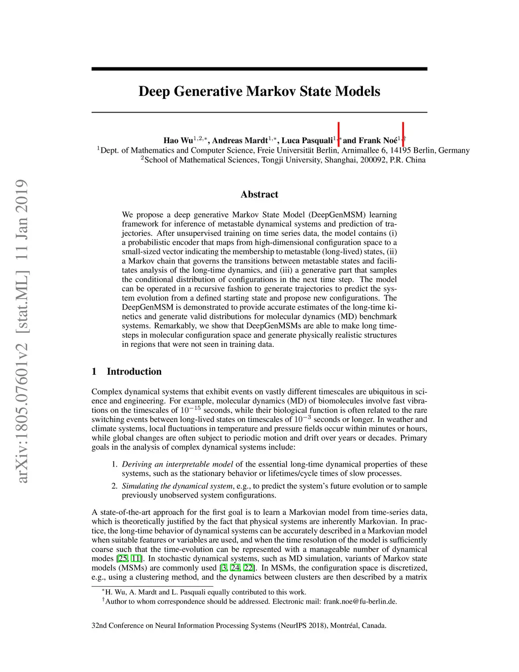 We propose a deep generative Markov State Model (DeepGenMSM) learning framework for inference of metastable dynamical systems and prediction of trajectories. After unsupervised training on time series data, the model contains (i) a probabilistic encoder that maps from high-dimensional configuration space to a small-sized vector indicating the membership to metastable (long-lived) states, (ii) a Markov chain that governs the transitions between metastable states and facilitates analysis of the long-time dynamics, and (iii) a generative part that samples the conditional distribution of configurations in the next time step. The model can be operated in a recursive fashion to generate trajectories to predict the system evolution from a defined starting state and propose new configurations. The DeepGenMSM is demonstrated to provide accurate estimates of the long-time kinetics and generate valid distributions for molecular dynamics (MD) benchmark systems. Remarkably, we show that DeepGenMSMs are able to make long time-steps in molecular configuration space and generate physically realistic structures in regions that were not seen in training data.