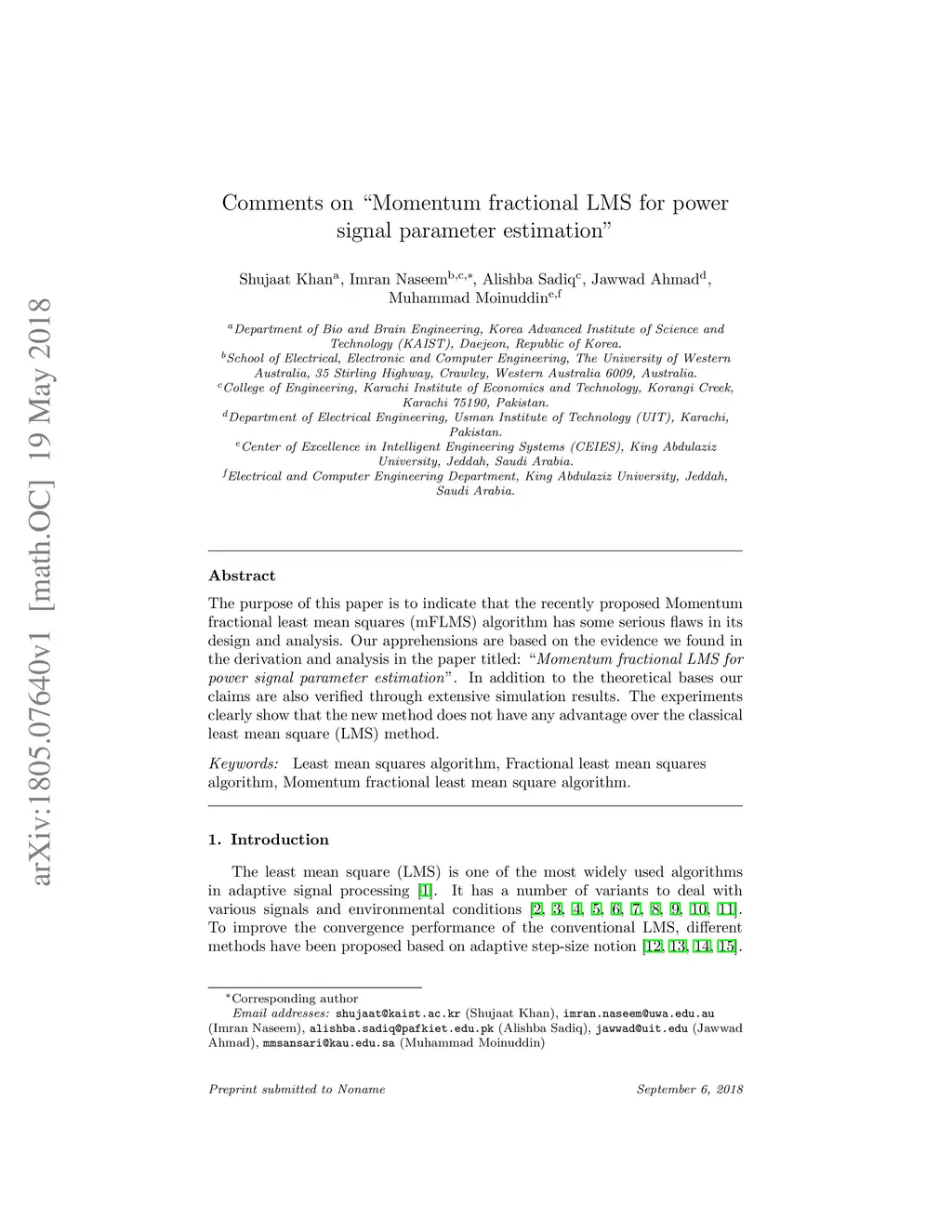 Comments on "Momentum fractional LMS for power signal parameter