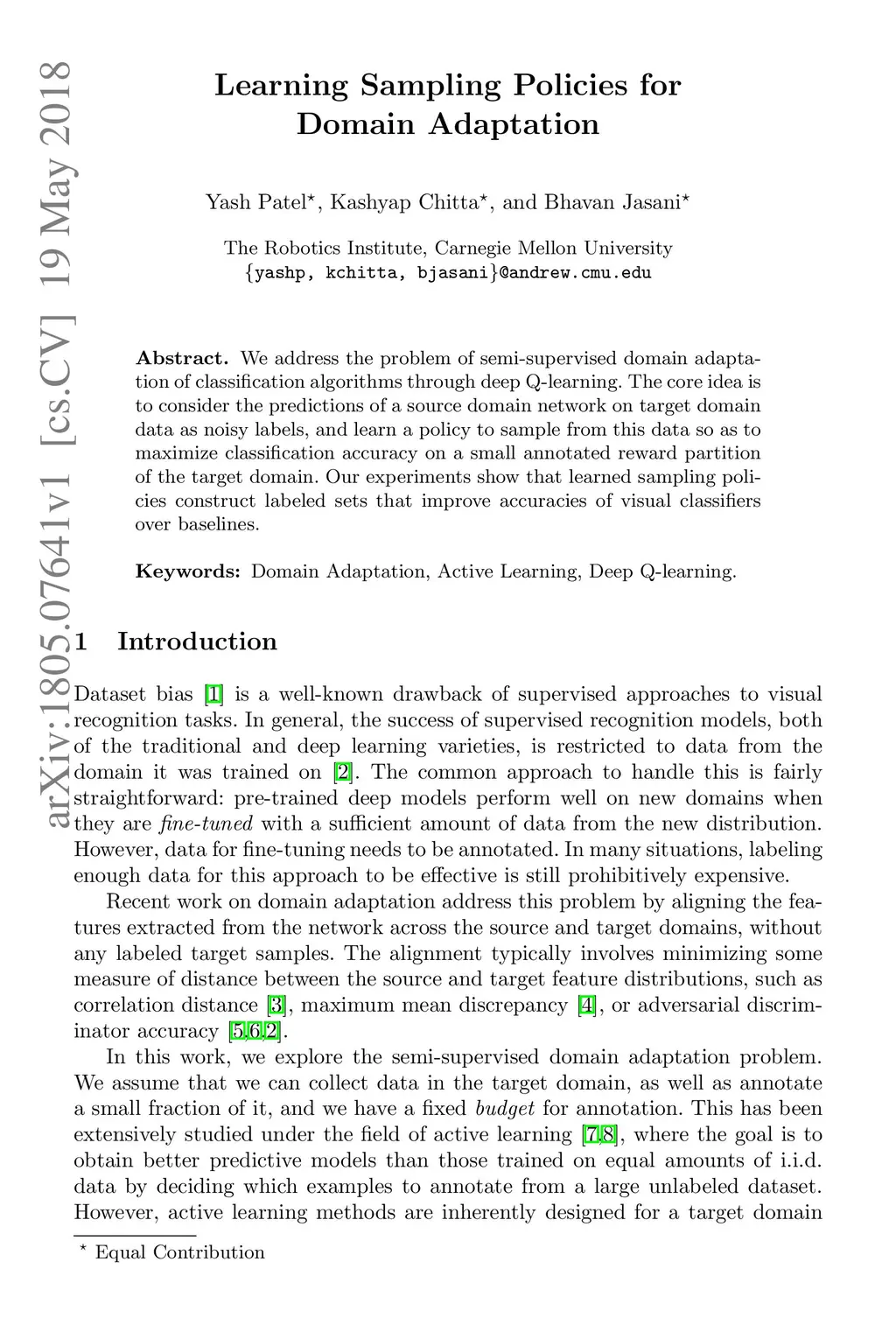 We address the problem of semi-supervised domain adaptation of classification algorithms through deep Q-learning. The core idea is to consider the predictions of a source domain network on target domain data as noisy labels, and learn a policy to sample from this data so as to maximize classification accuracy on a small annotated reward partition of the target domain. Our experiments show that learned sampling policies construct labeled sets that improve accuracies of visual classifiers over baselines.