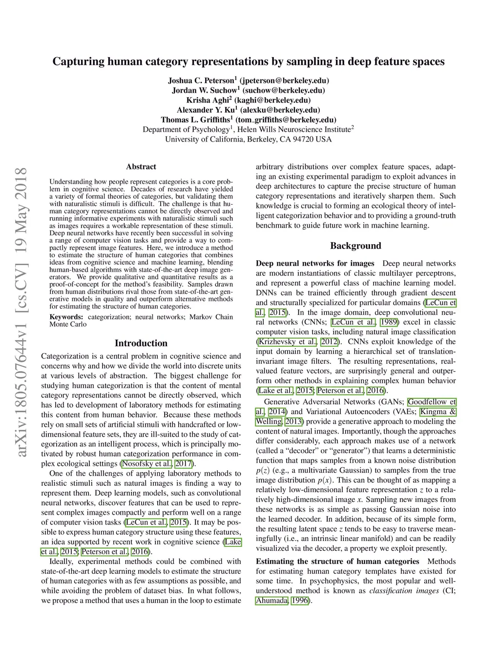 Understanding how people represent categories is a core problem in cognitive science. Decades of research have yielded a variety of formal theories of categories, but validating them with naturalistic stimuli is difficult. The challenge is that human category representations cannot be directly observed and running informative experiments with naturalistic stimuli such as images requires a workable representation of these stimuli. Deep neural networks have recently been successful in solving a range of computer vision tasks and provide a way to compactly represent image features. Here, we introduce a method to estimate the structure of human categories that combines ideas from cognitive science and machine learning, blending human-based algorithms with state-of-the-art deep image generators. We provide qualitative and quantitative results as a proof-of-concept for the method's feasibility. Samples drawn from human distributions rival those from state-of-the-art generative models in quality and outperform alternative methods for estimating the structure of human categories.