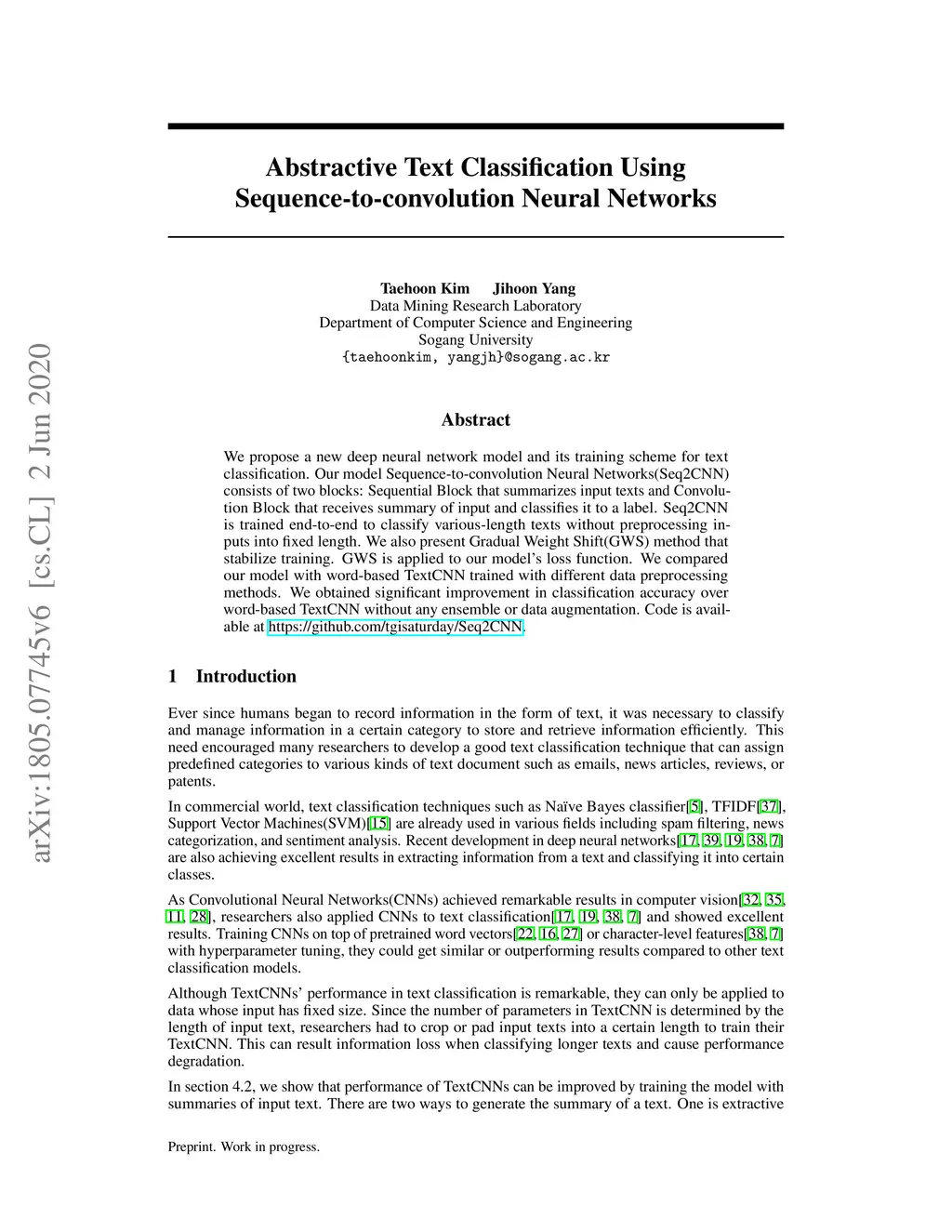 Abstractive Text Classification Using Sequence-to-convolution Neural