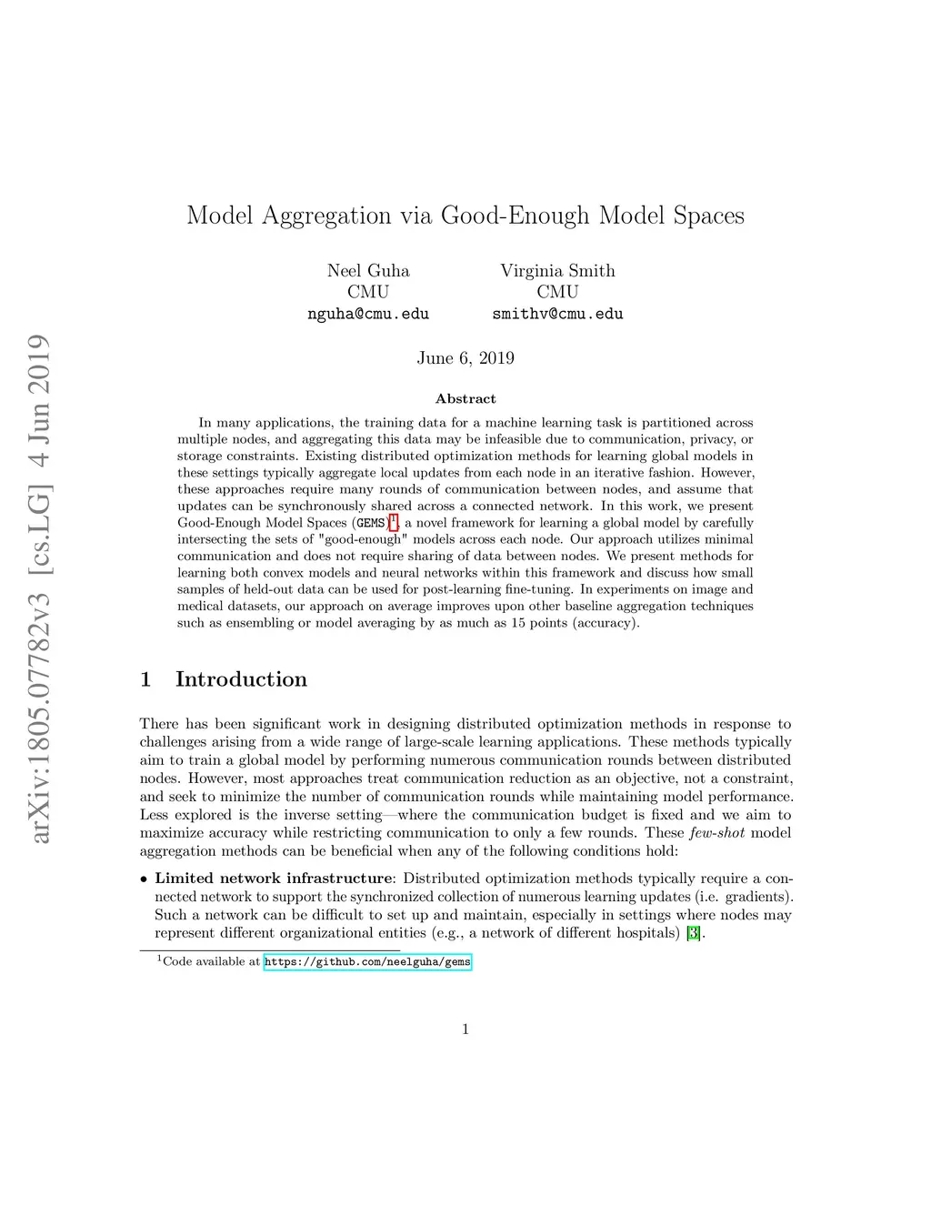In many applications, the training data for a machine learning task is partitioned across multiple nodes, and aggregating this data may be infeasible due to communication, privacy, or storage constraints. Existing distributed optimization methods for learning global models in these settings typically aggregate local updates from each node in an iterative fashion. However, these approaches require many rounds of communication between nodes, and assume that updates can be synchronously shared across a connected network. In this work, we present Good-Enough Model Spaces (GEMS), a novel framework for learning a global model by carefully intersecting the sets of "good-enough" models across each node. Our approach utilizes minimal communication and does not require sharing of data between nodes. We present methods for learning both convex models and neural networks within this framework and discuss how small samples of held-out data can be used for post-learning fine-tuning. In experiments on image and medical datasets, our approach on average improves upon other baseline aggregation techniques such as ensembling or model averaging by as much as 15 points (accuracy).