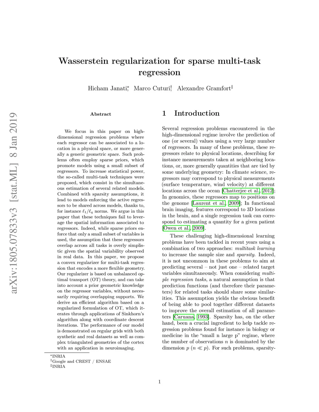We focus in this paper on high-dimensional regression problems where each regressor can be associated to a location in a physical space, or more generally a generic geometric space. Such problems often employ sparse priors, which promote models using a small subset of regressors. To increase statistical power, the so-called multi-task techniques were proposed, which consist in the simultaneous estimation of several related models. Combined with sparsity assumptions, it lead to models enforcing the active regressors to be shared across models, thanks to, for instance L1 / Lq norms. We argue in this paper that these techniques fail to leverage the spatial information associated to regressors. Indeed, while sparse priors enforce that only a small subset of variables is used, the assumption that these regressors overlap across all tasks is overly simplistic given the spatial variability observed in real data. In this paper, we propose a convex regularizer for multi-task regression that encodes a more flexible geometry. Our regularizer is based on unbalanced optimal transport (OT) theory, and can take into account a prior geometric knowledge on the regressor variables, without necessarily requiring overlapping supports. We derive an efficient algorithm based on a regularized formulation of OT, which iterates through applications of Sinkhorn's algorithm along with coordinate descent iterations. The performance of our model is demonstrated on regular grids with both synthetic and real datasets as well as complex triangulated geometries of the cortex with an application in neuroimaging.