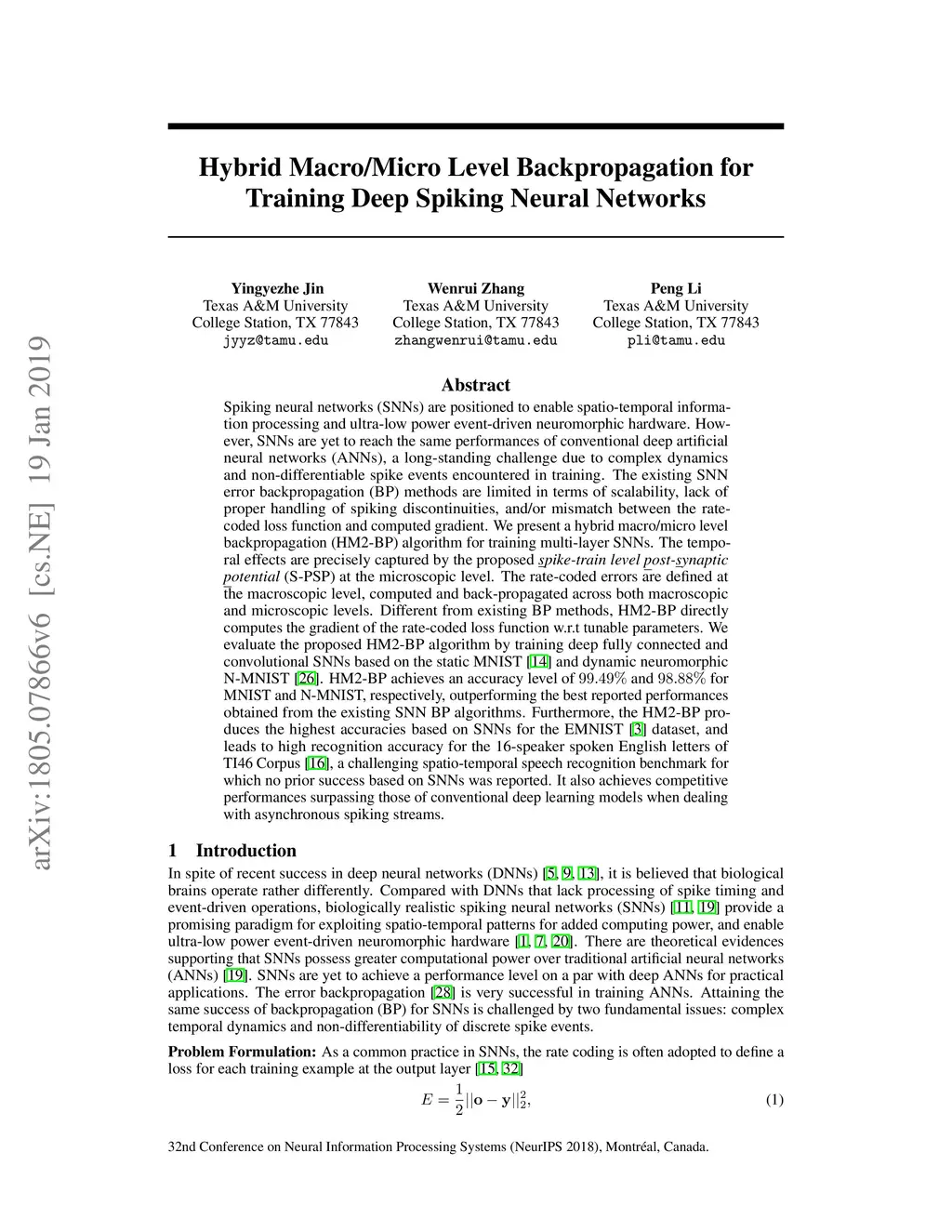 Spiking neural networks (SNNs) are positioned to enable spatio-temporal information processing and ultra-low power event-driven neuromorphic hardware. However, SNNs are yet to reach the same performances of conventional deep artificial neural networks (ANNs), a long-standing challenge due to complex dynamics and non-differentiable spike events encountered in training. The existing SNN error backpropagation (BP) methods are limited in terms of scalability, lack of proper handling of spiking discontinuities, and/or mismatch between the rate-coded loss function and computed gradient. We present a hybrid macro/micro level backpropagation (HM2-BP) algorithm for training multi-layer SNNs. The temporal effects are precisely captured by the proposed spike-train level post-synaptic potential (S-PSP) at the microscopic level. The rate-coded errors are defined at the macroscopic level, computed and back-propagated across both macroscopic and microscopic levels. Different from existing BP methods, HM2-BP directly computes the gradient of the rate-coded loss function w.r.t tunable parameters. We evaluate the proposed HM2-BP algorithm by training deep fully connected and convolutional SNNs based on the static MNIST [14] and dynamic neuromorphic N-MNIST [26]. HM2-BP achieves an accuracy level of 99.49% and 98.88% for MNIST and N-MNIST, respectively, outperforming the best reported performances obtained from the existing SNN BP algorithms. Furthermore, the HM2-BP produces the highest accuracies based on SNNs for the EMNIST [3] dataset, and leads to high recognition accuracy for the 16-speaker spoken English letters of TI46 Corpus [16], a challenging patio-temporal speech recognition benchmark for which no prior success based on SNNs was reported. It also achieves competitive performances surpassing those of conventional deep learning models when dealing with asynchronous spiking streams.