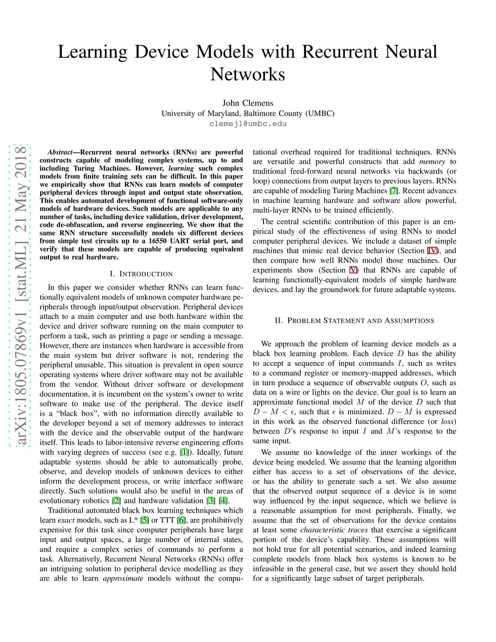 Recurrent neural networks (RNNs) are powerful constructs capable of modeling complex systems, up to and including Turing Machines. However, learning such complex models from finite training sets can be difficult. In this paper we empirically show that RNNs can learn models of computer peripheral devices through input and output state observation. This enables automated development of functional software-only models of hardware devices. Such models are applicable to any number of tasks, including device validation, driver development, code de-obfuscation, and reverse engineering. We show that the same RNN structure successfully models six different devices from simple test circuits up to a 16550 UART serial port, and verify that these models are capable of producing equivalent output to real hardware.