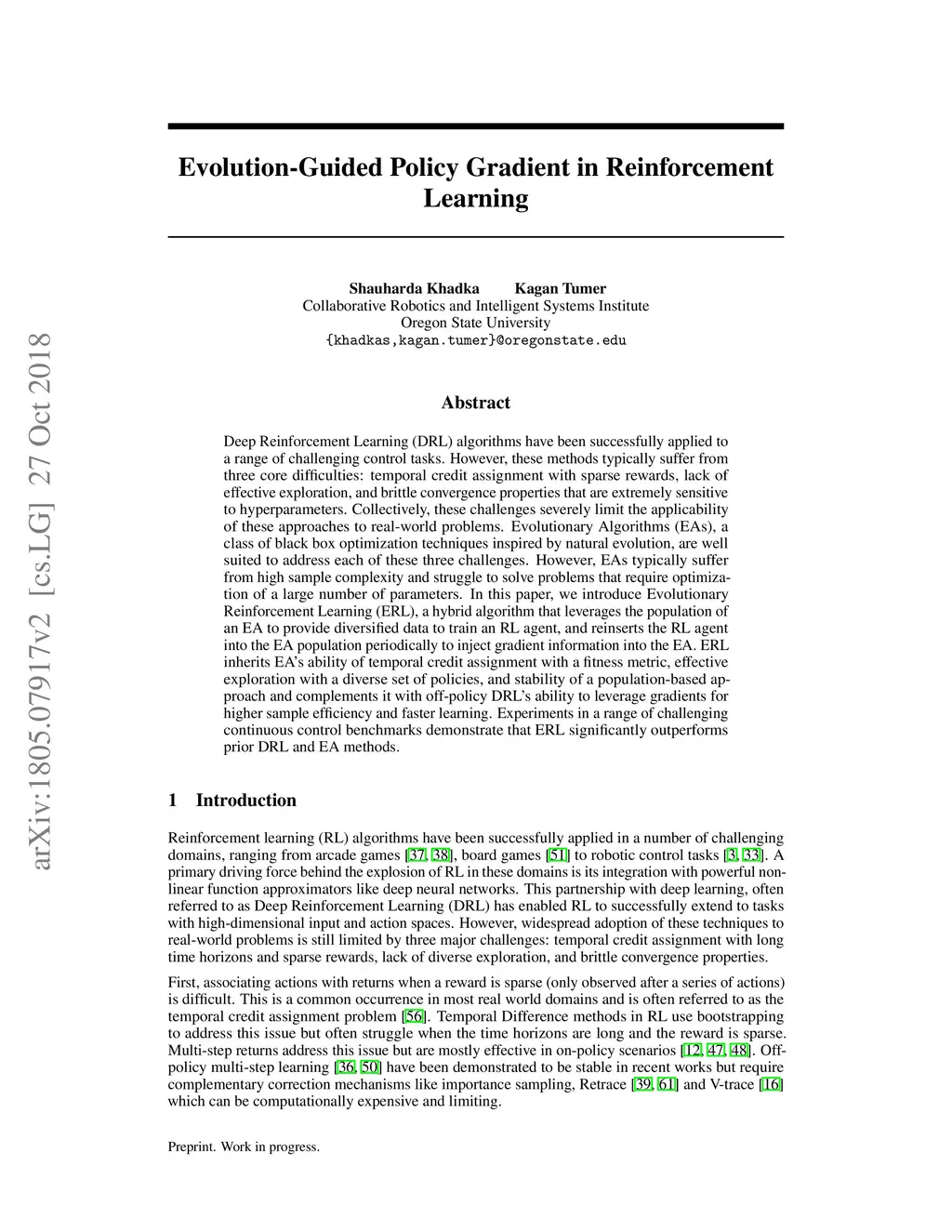 Evolution-Guided Policy Gradient in Reinforcement Learning
