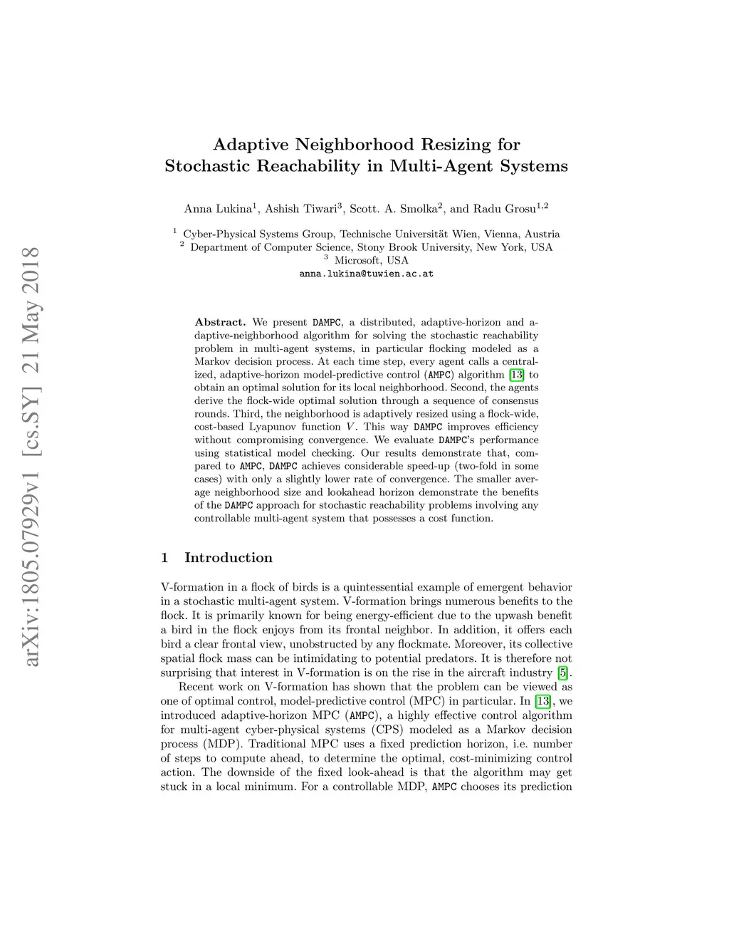 We present DAMPC, a distributed, adaptive-horizon and adaptive-neighborhood algorithm for solving the stochastic reachability problem in multi-agent systems, in particular flocking modeled as a Markov decision process. At each time step, every agent calls a centralized, adaptive-horizon model-predictive control (AMPC) algorithm to obtain an optimal solution for its local neighborhood. Second, the agents derive the flock-wide optimal solution through a sequence of consensus rounds. Third, the neighborhood is adaptively resized using a flock-wide, cost-based Lyapunov function V. This way DAMPC improves efficiency without compromising convergence. We evaluate DAMPC's performance using statistical model checking. Our results demonstrate that, compared to AMPC, DAMPC achieves considerable speed-up (two-fold in some cases) with only a slightly lower rate of convergence. The smaller average neighborhood size and lookahead horizon demonstrate the benefits of the DAMPC approach for stochastic reachability problems involving any controllable multi-agent system that possesses a cost function.