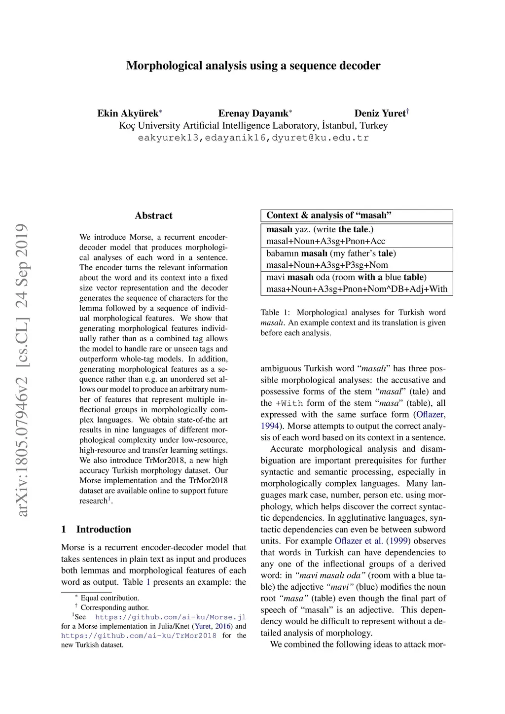 Morphological analysis using a sequence decoder