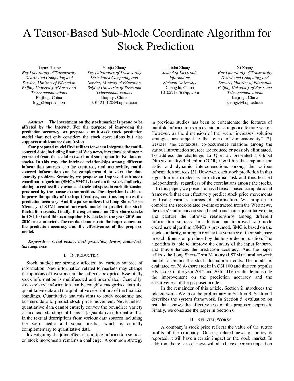The investment on the stock market is prone to be affected by the Internet. For the purpose of improving the prediction accuracy, we propose a multi-task stock prediction model that not only considers the stock correlations but also supports multi-source data fusion. Our proposed model first utilizes tensor to integrate the multi-sourced data, including financial Web news, investors' sentiments extracted from the social network and some quantitative data on stocks. In this way, the intrinsic relationships among different information sources can be captured, and meanwhile, multi-sourced information can be complemented to solve the data sparsity problem. Secondly, we propose an improved sub-mode coordinate algorithm (SMC). SMC is based on the stock similarity, aiming to reduce the variance of their subspace in each dimension produced by the tensor decomposition. The algorithm is able to improve the quality of the input features, and thus improves the prediction accuracy. And the paper utilizes the Long Short-Term Memory (LSTM) neural network model to predict the stock fluctuation trends. Finally, the experiments on 78 A-share stocks in CSI 100 and thirteen popular HK stocks in the year 2015 and 2016 are conducted. The results demonstrate the improvement on the prediction accuracy and the effectiveness of the proposed model.