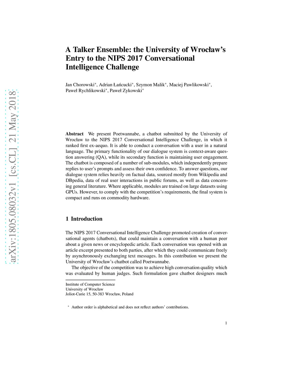 A Talker Ensemble: the University of Wrocław's Entry to the NIPS 2017