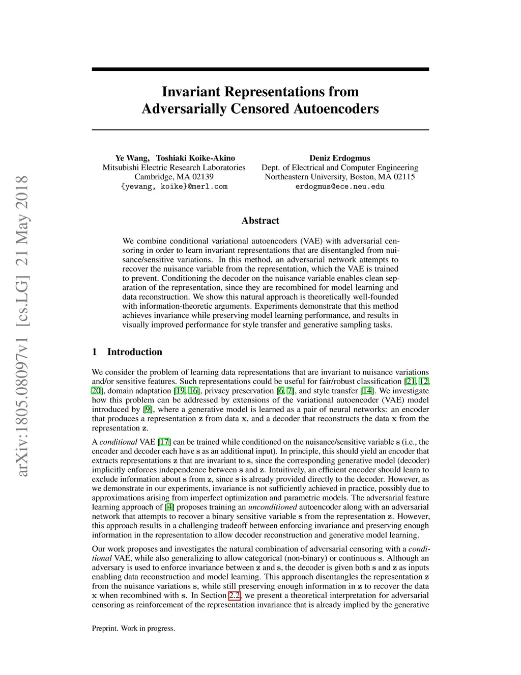 We combine conditional variational autoencoders (VAE) with adversarial censoring in order to learn invariant representations that are disentangled from nuisance/sensitive variations. In this method, an adversarial network attempts to recover the nuisance variable from the representation, which the VAE is trained to prevent. Conditioning the decoder on the nuisance variable enables clean separation of the representation, since they are recombined for model learning and data reconstruction. We show this natural approach is theoretically well-founded with information-theoretic arguments. Experiments demonstrate that this method achieves invariance while preserving model learning performance, and results in visually improved performance for style transfer and generative sampling tasks.