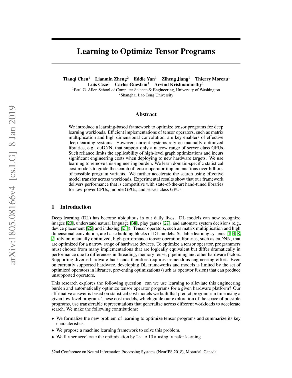 We introduce a learning-based framework to optimize tensor programs for deep learning workloads. Efficient implementations of tensor operators, such as matrix multiplication and high dimensional convolution, are key enablers of effective deep learning systems. However, existing systems rely on manually optimized libraries such as cuDNN where only a narrow range of server class GPUs are well-supported. The reliance on hardware-specific operator libraries limits the applicability of high-level graph optimizations and incurs significant engineering costs when deploying to new hardware targets. We use learning to remove this engineering burden. We learn domain-specific statistical cost models to guide the search of tensor operator implementations over billions of possible program variants. We further accelerate the search by effective model transfer across workloads. Experimental results show that our framework delivers performance competitive with state-of-the-art hand-tuned libraries for low-power CPU, mobile GPU, and server-class GPU.