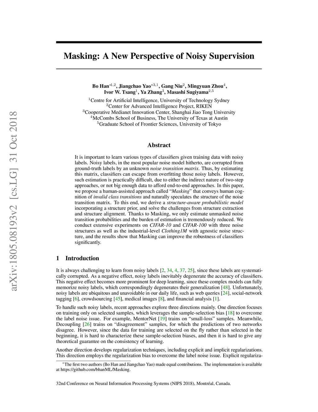Masking: A New Perspective of Noisy Supervision