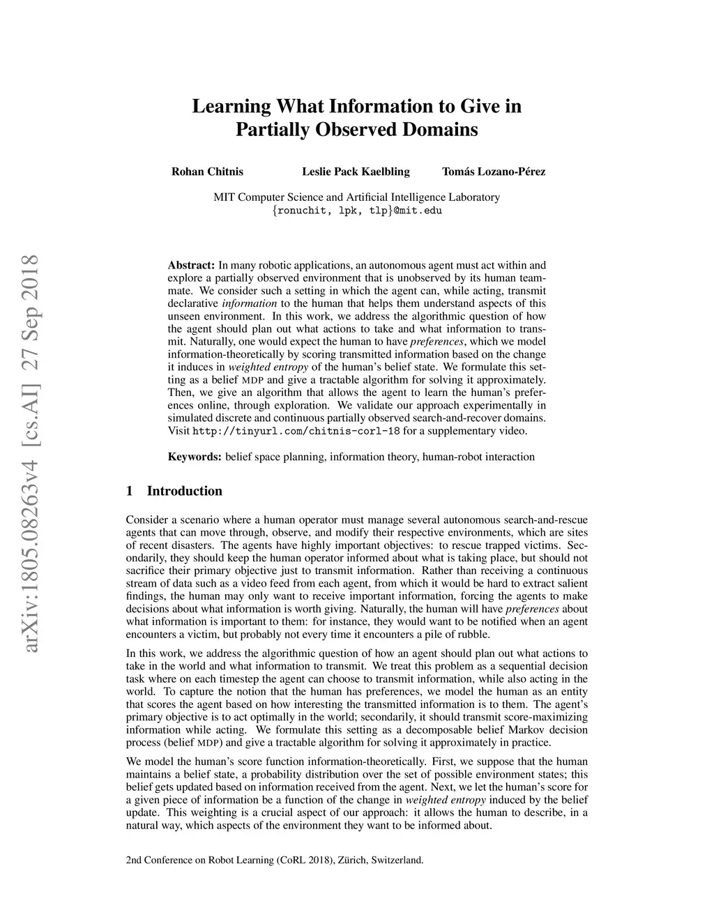 In many robotic applications, an autonomous agent must act within and explore a partially observed environment that is unobserved by its human teammate. We consider such a setting in which the agent can, while acting, transmit declarative information to the human that helps them understand aspects of this unseen environment. In this work, we address the algorithmic question of how the agent should plan out what actions to take and what information to transmit. Naturally, one would expect the human to have preferences, which we model information-theoretically by scoring transmitted information based on the change it induces in weighted entropy of the human's belief state. We formulate this setting as a belief MDP and give a tractable algorithm for solving it approximately. Then, we give an algorithm that allows the agent to learn the human's preferences online, through exploration. We validate our approach experimentally in simulated discrete and continuous partially observed search-and-recover domains. Visit http://tinyurl.com/chitnis-corl-18 for a supplementary video.