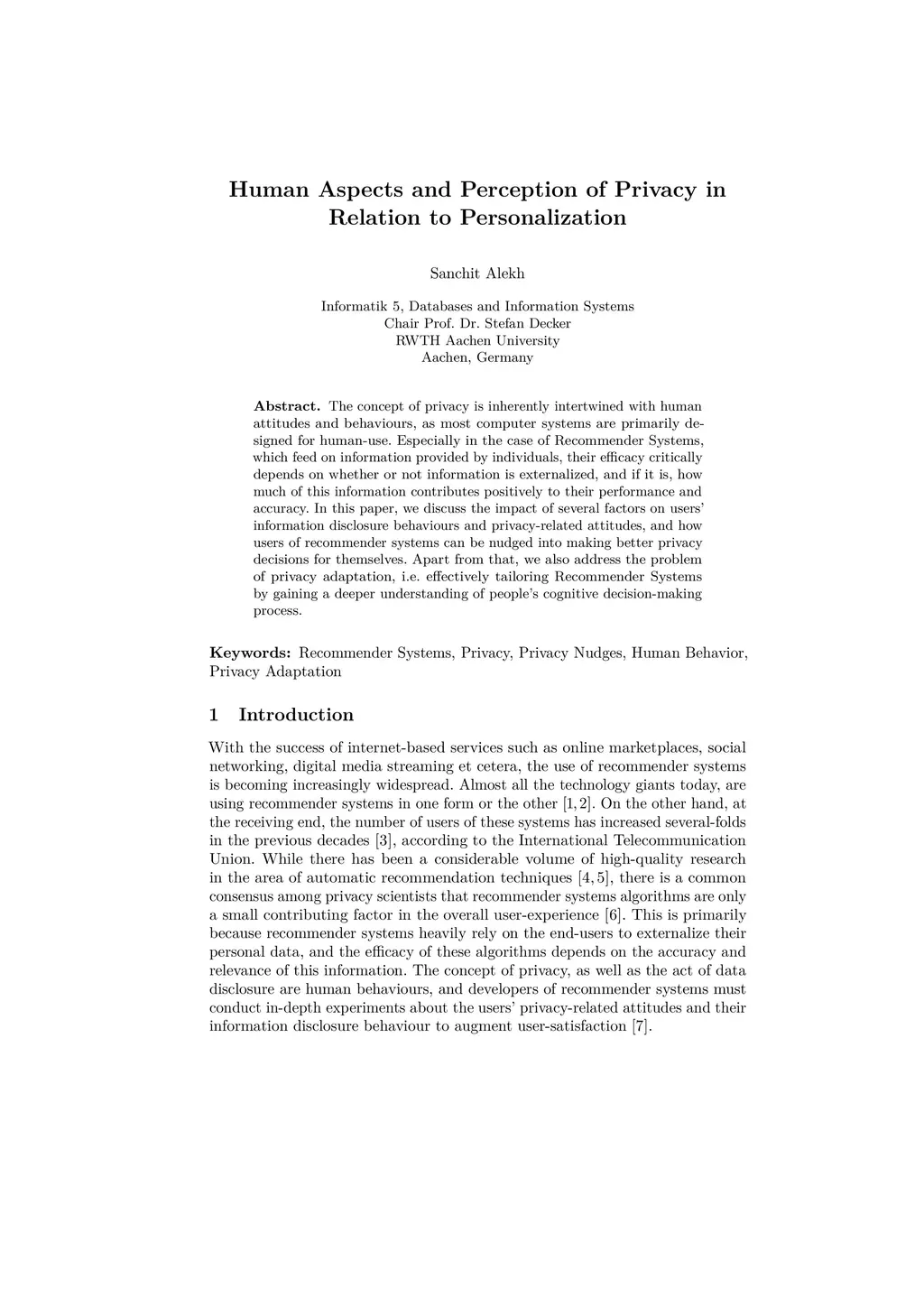 Human Aspects and Perception of Privacy in Relation to Personalization
