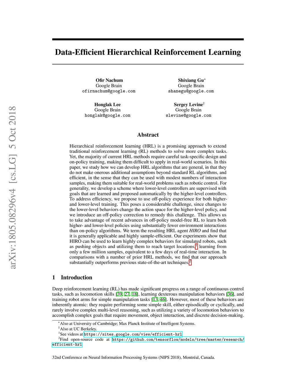 Data-Efficient Hierarchical Reinforcement Learning