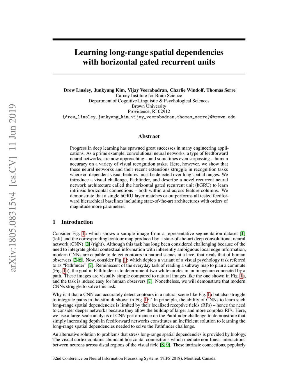 Progress in deep learning has spawned great successes in many engineering applications. As a prime example, convolutional neural networks, a type of feedforward neural networks, are now approaching -- and sometimes even surpassing -- human accuracy on a variety of visual recognition tasks. Here, however, we show that these neural networks and their recent extensions struggle in recognition tasks where co-dependent visual features must be detected over long spatial ranges. We introduce the horizontal gated-recurrent unit (hGRU) to learn intrinsic horizontal connections -- both within and across feature columns. We demonstrate that a single hGRU layer matches or outperforms all tested feedforward hierarchical baselines including state-of-the-art architectures which have orders of magnitude more free parameters. We further discuss the biological plausibility of the hGRU in comparison to anatomical data from the visual cortex as well as human behavioral data on a classic contour detection task.