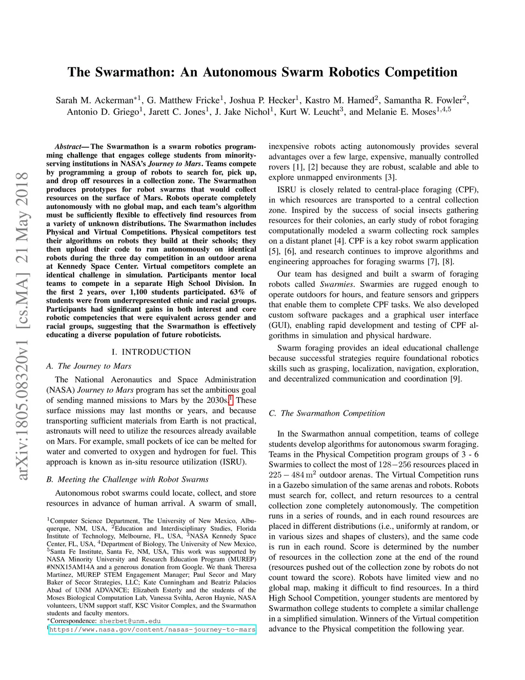 The Swarmathon is a swarm robotics programming challenge that engages college students from minority-serving institutions in NASA's Journey to Mars. Teams compete by programming a group of robots to search for, pick up, and drop off resources in a collection zone. The Swarmathon produces prototypes for robot swarms that would collect resources on the surface of Mars. Robots operate completely autonomously with no global map, and each team's algorithm must be sufficiently flexible to effectively find resources from a variety of unknown distributions. The Swarmathon includes Physical and Virtual Competitions. Physical competitors test their algorithms on robots they build at their schools; they then upload their code to run autonomously on identical robots during the three day competition in an outdoor arena at Kennedy Space Center. Virtual competitors complete an identical challenge in simulation. Participants mentor local teams to compete in a separate High School Division. In the first 2 years, over 1,100 students participated. 63% of students were from underrepresented ethnic and racial groups. Participants had significant gains in both interest and core robotic competencies that were equivalent across gender and racial groups, suggesting that the Swarmathon is effectively educating a diverse population of future roboticists.