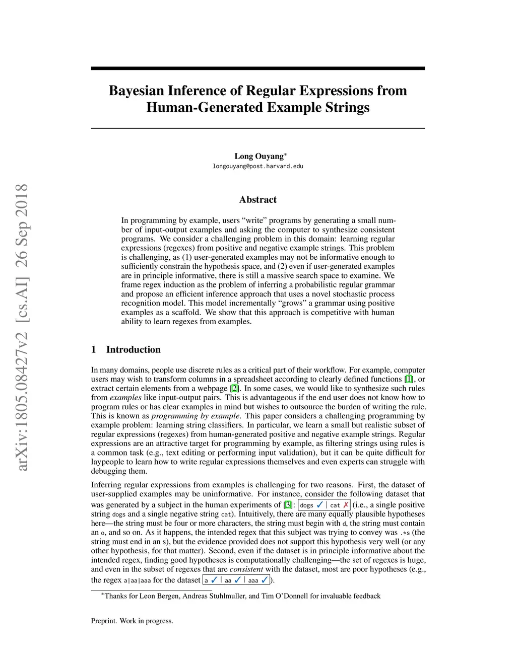 In programming by example, users "write" programs by generating a small number of input-output examples and asking the computer to synthesize consistent programs. We consider a challenging problem in this domain: learning regular expressions (regexes) from positive and negative example strings. This problem is challenging, as (1) user-generated examples may not be informative enough to sufficiently constrain the hypothesis space, and (2) even if user-generated examples are in principle informative, there is still a massive search space to examine. We frame regex induction as the problem of inferring a probabilistic regular grammar and propose an efficient inference approach that uses a novel stochastic process recognition model. This model incrementally "grows" a grammar using positive examples as a scaffold. We show that this approach is competitive with human ability to learn regexes from examples.
