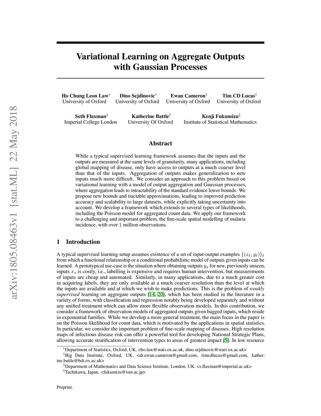 While a typical supervised learning framework assumes that the inputs and the outputs are measured at the same levels of granularity, many applications, including global mapping of disease, only have access to outputs at a much coarser level than that of the inputs. Aggregation of outputs makes generalization to new inputs much more difficult. We consider an approach to this problem based on variational learning with a model of output aggregation and Gaussian processes, where aggregation leads to intractability of the standard evidence lower bounds. We propose new bounds and tractable approximations, leading to improved prediction accuracy and scalability to large datasets, while explicitly taking uncertainty into account. We develop a framework which extends to several types of likelihoods, including the Poisson model for aggregated count data. We apply our framework to a challenging and important problem, the fine-scale spatial modelling of malaria incidence, with over 1 million observations.