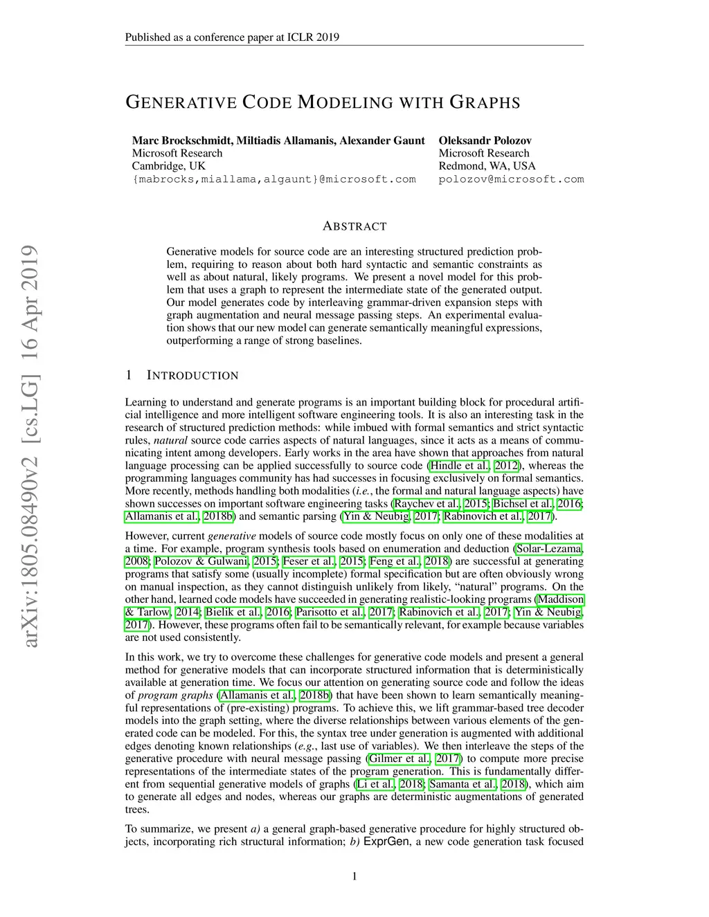 Generative models for source code are an interesting structured prediction problem, requiring to reason about both hard syntactic and semantic constraints as well as about natural, likely programs. We present a novel model for this problem that uses a graph to represent the intermediate state of the generated output. The generative procedure interleaves grammar-driven expansion steps with graph augmentation and neural message passing steps. An experimental evaluation shows that our new model can generate semantically meaningful expressions, outperforming a range of strong baselines.