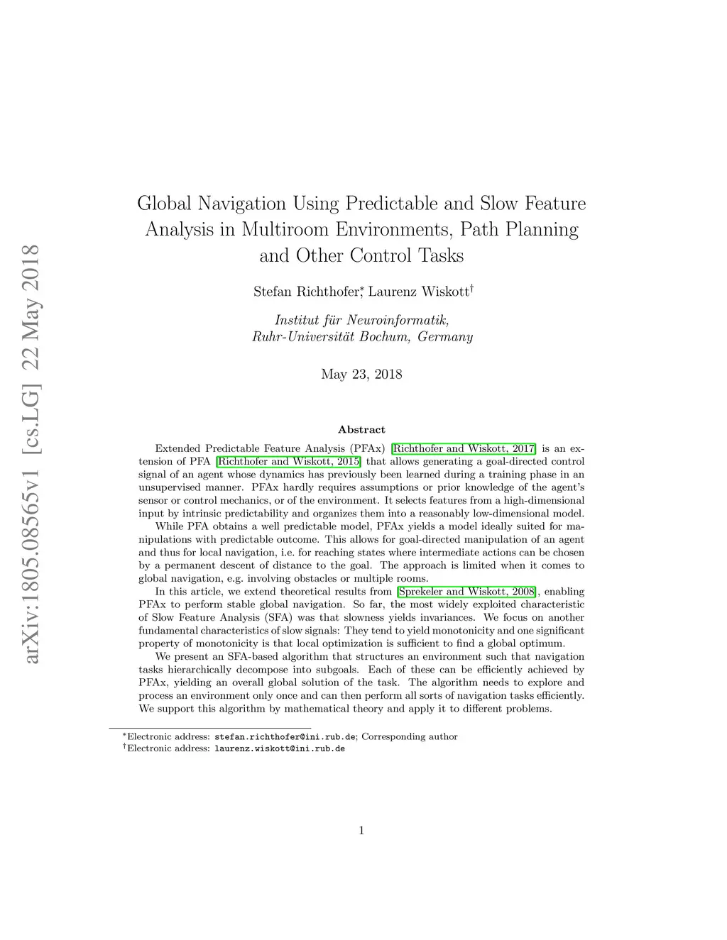 Extended Predictable Feature Analysis (PFAx) [Richthofer and Wiskott, 2017] is an extension of PFA [Richthofer and Wiskott, 2015] that allows generating a goal-directed control signal of an agent whose dynamics has previously been learned during a training phase in an unsupervised manner. PFAx hardly requires assumptions or prior knowledge of the agent's sensor or control mechanics, or of the environment. It selects features from a high-dimensional input by intrinsic predictability and organizes them into a reasonably low-dimensional model. While PFA obtains a well predictable model, PFAx yields a model ideally suited for manipulations with predictable outcome. This allows for goal-directed manipulation of an agent and thus for local navigation, i.e. for reaching states where intermediate actions can be chosen by a permanent descent of distance to the goal. The approach is limited when it comes to global navigation, e.g. involving obstacles or multiple rooms. In this article, we extend theoretical results from [Sprekeler and Wiskott, 2008], enabling PFAx to perform stable global navigation. So far, the most widely exploited characteristic of Slow Feature Analysis (SFA) was that slowness yields invariances. We focus on another fundamental characteristics of slow signals: They tend to yield monotonicity and one significant property of monotonicity is that local optimization is sufficient to find a global optimum. We present an SFA-based algorithm that structures an environment such that navigation tasks hierarchically decompose into subgoals. Each of these can be efficiently achieved by PFAx, yielding an overall global solution of the task. The algorithm needs to explore and process an environment only once and can then perform all sorts of navigation tasks efficiently. We support this algorithm by mathematical theory and apply it to different problems.