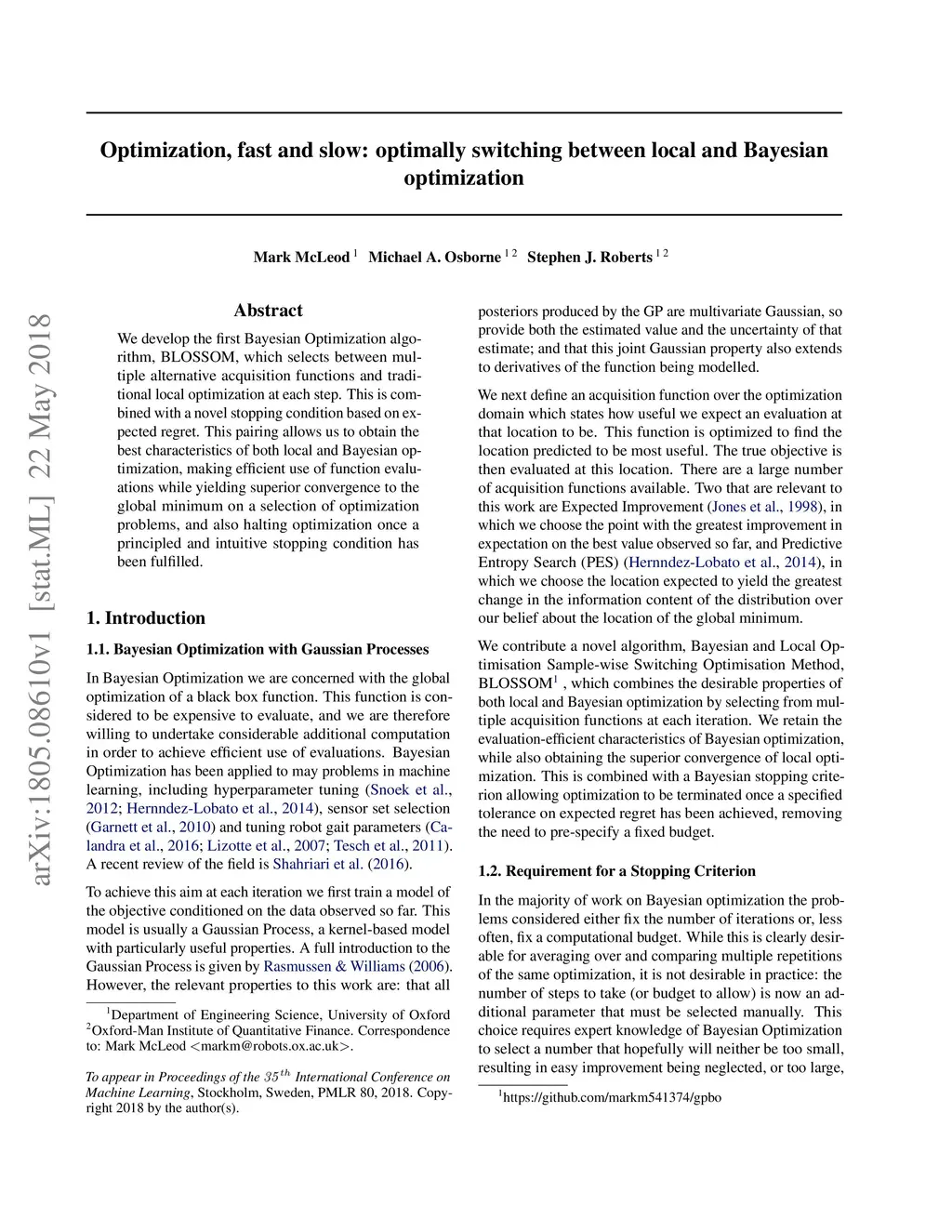 We develop the first Bayesian Optimization algorithm, BLOSSOM, which selects between multiple alternative acquisition functions and traditional local optimization at each step. This is combined with a novel stopping condition based on expected regret. This pairing allows us to obtain the best characteristics of both local and Bayesian optimization, making efficient use of function evaluations while yielding superior convergence to the global minimum on a selection of optimization problems, and also halting optimization once a principled and intuitive stopping condition has been fulfilled.