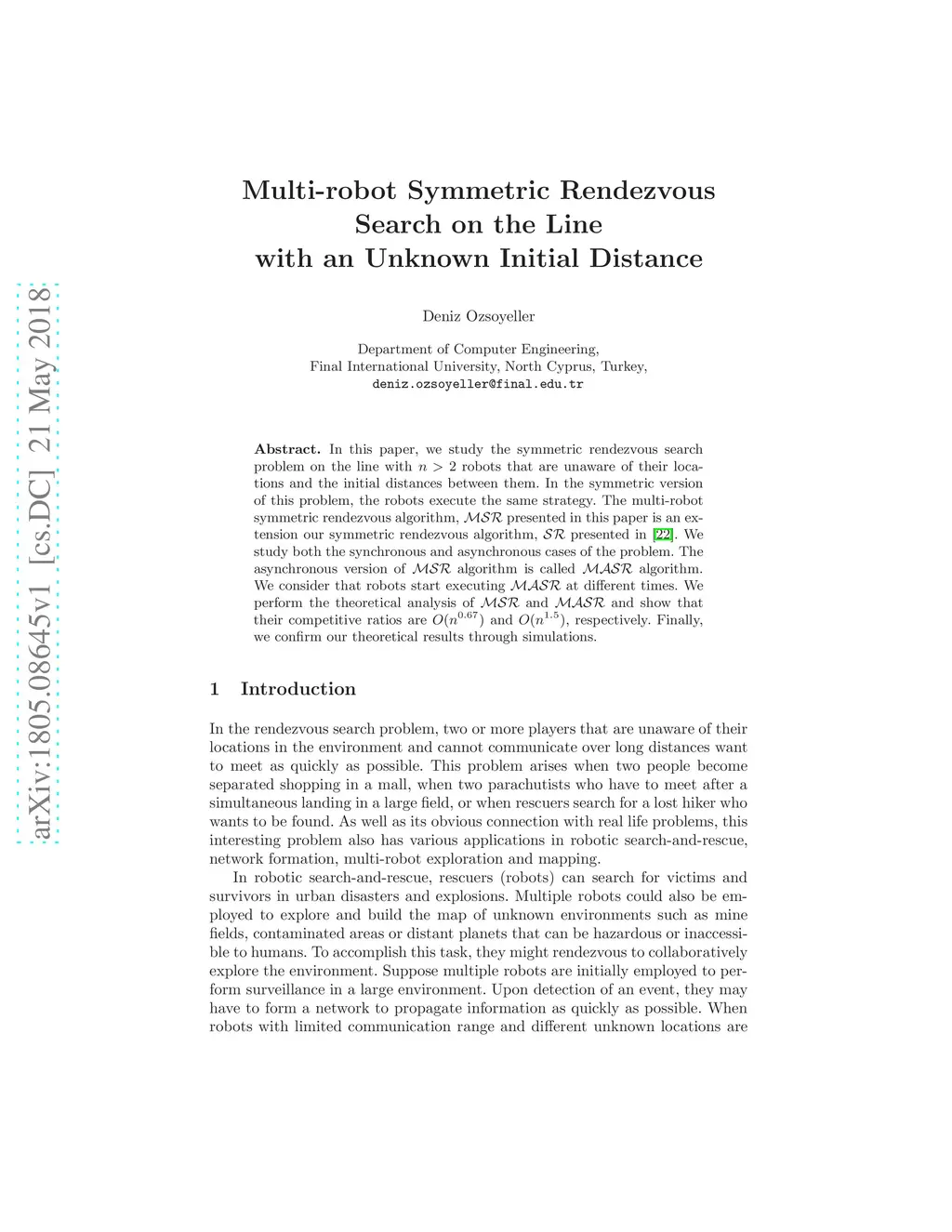 In this paper, we study the symmetric rendezvous search problem on the line with n > 2 robots that are unaware of their locations and the initial distances between them. In the symmetric version of this problem, the robots execute the same strategy. The multi-robot symmetric rendezvous algorithm, MSR presented in this paper is an extension our symmetric rendezvous algorithm, SR presented in [23]. We study both the synchronous and asynchronous cases of the problem. The asynchronous version of MSR algorithm is called MASR algorithm. We consider that robots start executing MASR at different times. We perform the theoretical analysis of MSR and MASR, and show that their competitive ratios are and , respectively. Finally, we confirm our theoretical results through simulations.