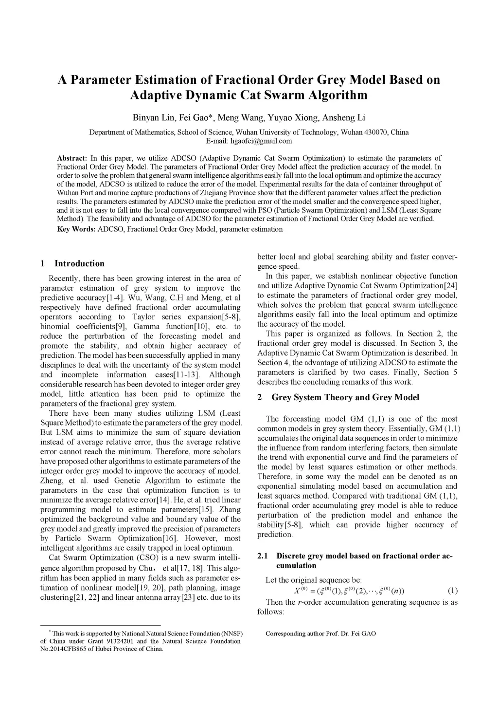 In this paper, we utilize ADCSO (Adaptive Dynamic Cat Swarm Optimization) to estimate the parameters of Fractional Order Grey Model. The parameters of Fractional Order Grey Model affect the prediction accuracy of the model. In order to solve the problem that general swarm intelligence algorithms easily fall into the local optimum and optimize the accuracy of the model, ADCSO is utilized to reduce the error of the model. Experimental results for the data of container throughput of Wuhan Port and marine capture productions of Zhejiang Province show that the different parameter values affect the prediction results. The parameters estimated by ADCSO make the prediction error of the model smaller and the convergence speed higher, and it is not easy to fall into the local convergence compared with PSO (Particle Swarm Optimization) and LSM (Least Square Method). The feasibility and advantage of ADCSO for the parameter estimation of Fractional Order Grey Model are verified.