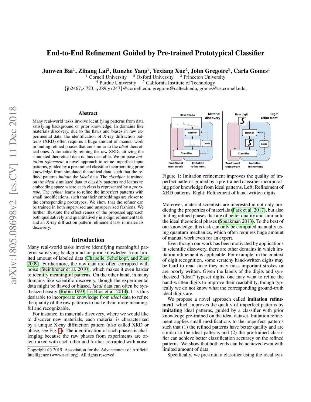 Many real-world tasks involve identifying patterns from data satisfying background or prior knowledge. In domains like materials discovery, due to the flaws and biases in raw experimental data, the identification of X-ray diffraction patterns (XRD) often requires a huge amount of manual work in finding refined phases that are similar to the ideal theoretical ones. Automatically refining the raw XRDs utilizing the simulated theoretical data is thus desirable. We propose imitation refinement, a novel approach to refine imperfect input patterns, guided by a pre-trained classifier incorporating prior knowledge from simulated theoretical data, such that the refined patterns imitate the ideal data. The classifier is trained on the ideal simulated data to classify patterns and learns an embedding space where each class is represented by a prototype. The refiner learns to refine the imperfect patterns with small modifications, such that their embeddings are closer to the corresponding prototypes. We show that the refiner can be trained in both supervised and unsupervised fashions. We further illustrate the effectiveness of the proposed approach both qualitatively and quantitatively in a digit refinement task and an X-ray diffraction pattern refinement task in materials discovery.