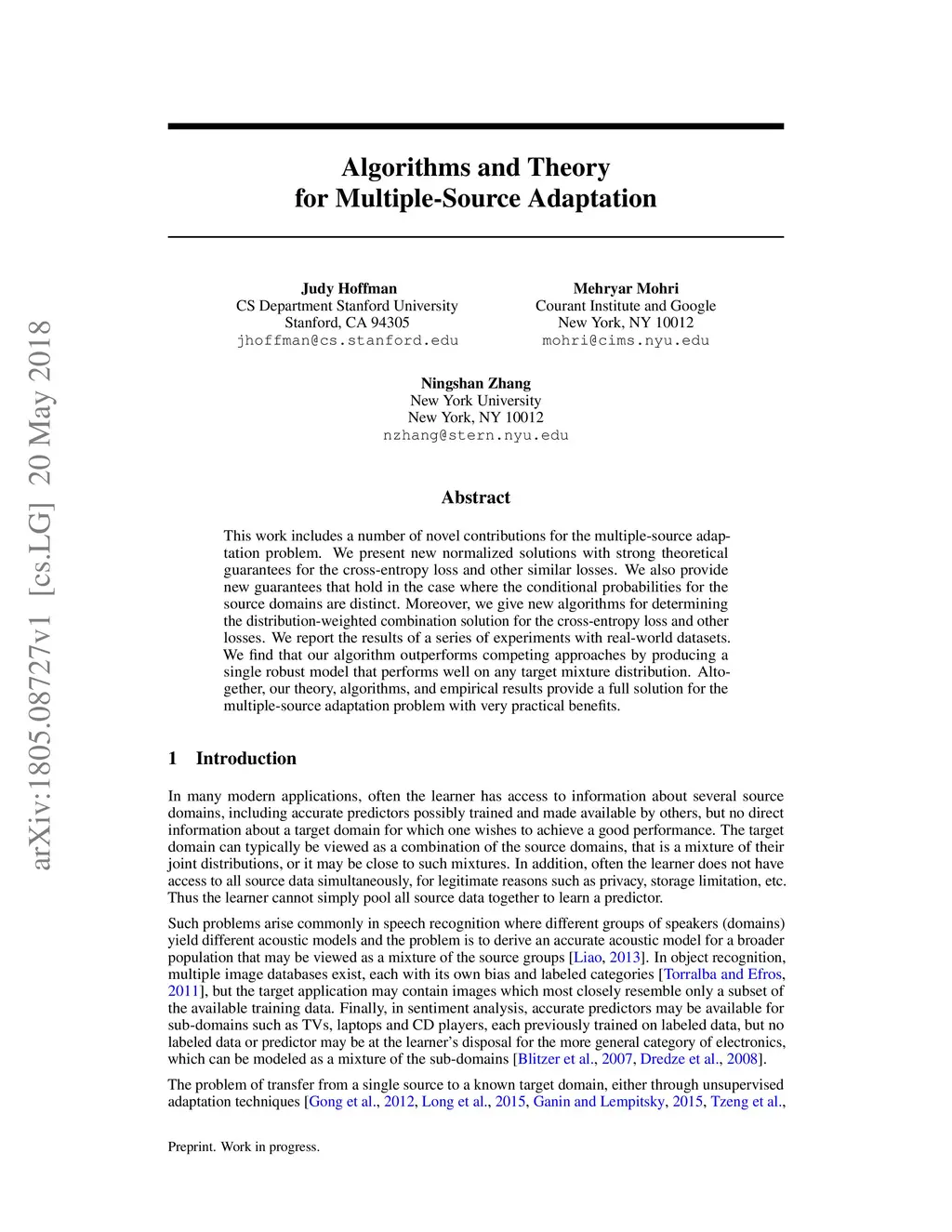 This work includes a number of novel contributions for the multiple-source adaptation problem. We present new normalized solutions with strong theoretical guarantees for the cross-entropy loss and other similar losses. We also provide new guarantees that hold in the case where the conditional probabilities for the source domains are distinct. Moreover, we give new algorithms for determining the distribution-weighted combination solution for the cross-entropy loss and other losses. We report the results of a series of experiments with real-world datasets. We find that our algorithm outperforms competing approaches by producing a single robust model that performs well on any target mixture distribution. Altogether, our theory, algorithms, and empirical results provide a full solution for the multiple-source adaptation problem with very practical benefits.