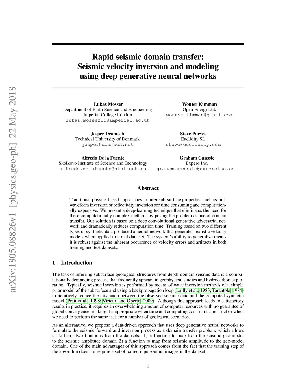 Traditional physics-based approaches to infer sub-surface properties such as full-waveform inversion or reflectivity inversion are time-consuming and computationally expensive. We present a deep-learning technique that eliminates the need for these computationally complex methods by posing the problem as one of domain transfer. Our solution is based on a deep convolutional generative adversarial network and dramatically reduces computation time. Training based on two different types of synthetic data produced a neural network that generates realistic velocity models when applied to a real dataset. The system's ability to generalize means it is robust against the inherent occurrence of velocity errors and artifacts in both training and test datasets.