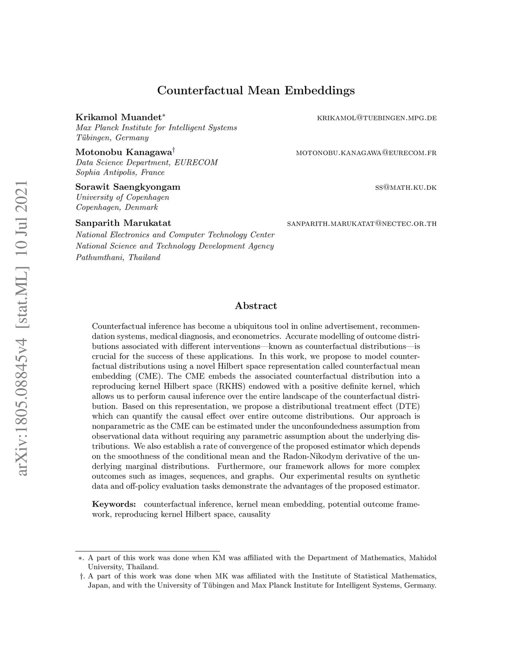 Counterfactual inference has become a ubiquitous tool in online advertisement, recommendation systems, medical diagnosis, and econometrics. Accurate modeling of outcome distributions associated with different interventions -- known as counterfactual distributions -- is crucial for the success of these applications. In this work, we propose to model counterfactual distributions using a novel Hilbert space representation called counterfactual mean embedding (CME). The CME embeds the associated counterfactual distribution into a reproducing kernel Hilbert space (RKHS) endowed with a positive definite kernel, which allows us to perform causal inference over the entire landscape of the counterfactual distribution. Based on this representation, we propose a distributional treatment effect (DTE) that can quantify the causal effect over entire outcome distributions. Our approach is nonparametric as the CME can be estimated under the unconfoundedness assumption from observational data without requiring any parametric assumption about the underlying distributions. We also establish a rate of convergence of the proposed estimator which depends on the smoothness of the conditional mean and the Radon-Nikodym derivative of the underlying marginal distributions. Furthermore, our framework allows for more complex outcomes such as images, sequences, and graphs. Our experimental results on synthetic data and off-policy evaluation tasks demonstrate the advantages of the proposed estimator.