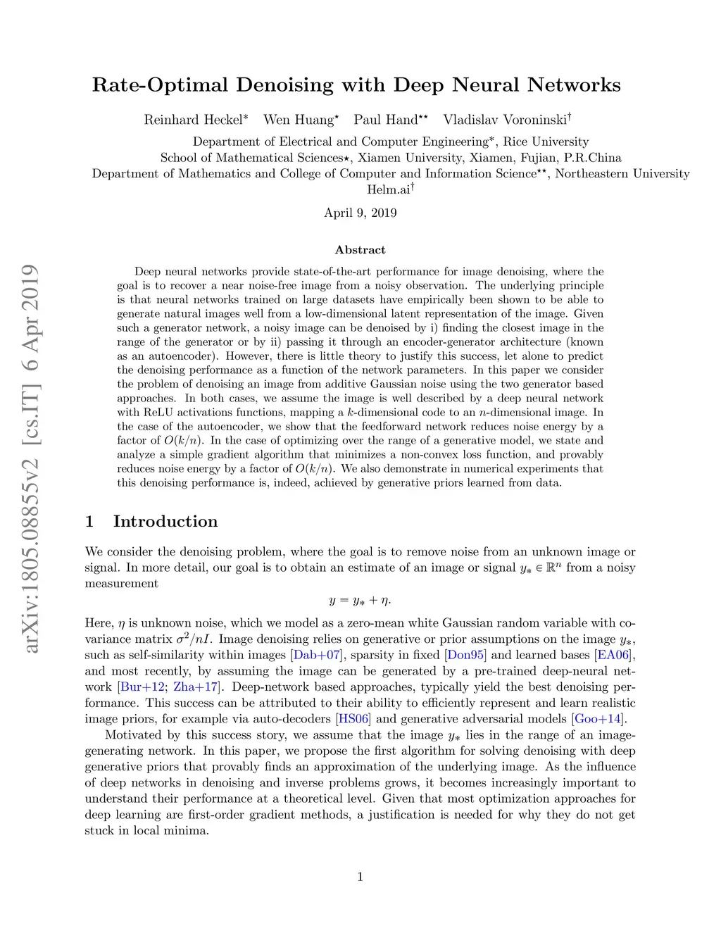 Deep neural networks provide state-of-the-art performance for image denoising, where the goal is to recover a near noise-free image from a noisy observation. The underlying principle is that neural networks trained on large datasets have empirically been shown to be able to generate natural images well from a low-dimensional latent representation of the image. Given such a generator network, a noisy image can be denoised by i) finding the closest image in the range of the generator or by ii) passing it through an encoder-generator architecture (known as an autoencoder). However, there is little theory to justify this success, let alone to predict the denoising performance as a function of the network parameters. In this paper we consider the problem of denoising an image from additive Gaussian noise using the two generator based approaches. In both cases, we assume the image is well described by a deep neural network with ReLU activations functions, mapping a -dimensional code to an -dimensional image. In the case of the autoencoder, we show that the feedforward network reduces noise energy by a factor of . In the case of optimizing over the range of a generative model, we state and analyze a simple gradient algorithm that minimizes a non-convex loss function, and provably reduces noise energy by a factor of . We also demonstrate in numerical experiments that this denoising performance is, indeed, achieved by generative priors learned from data.