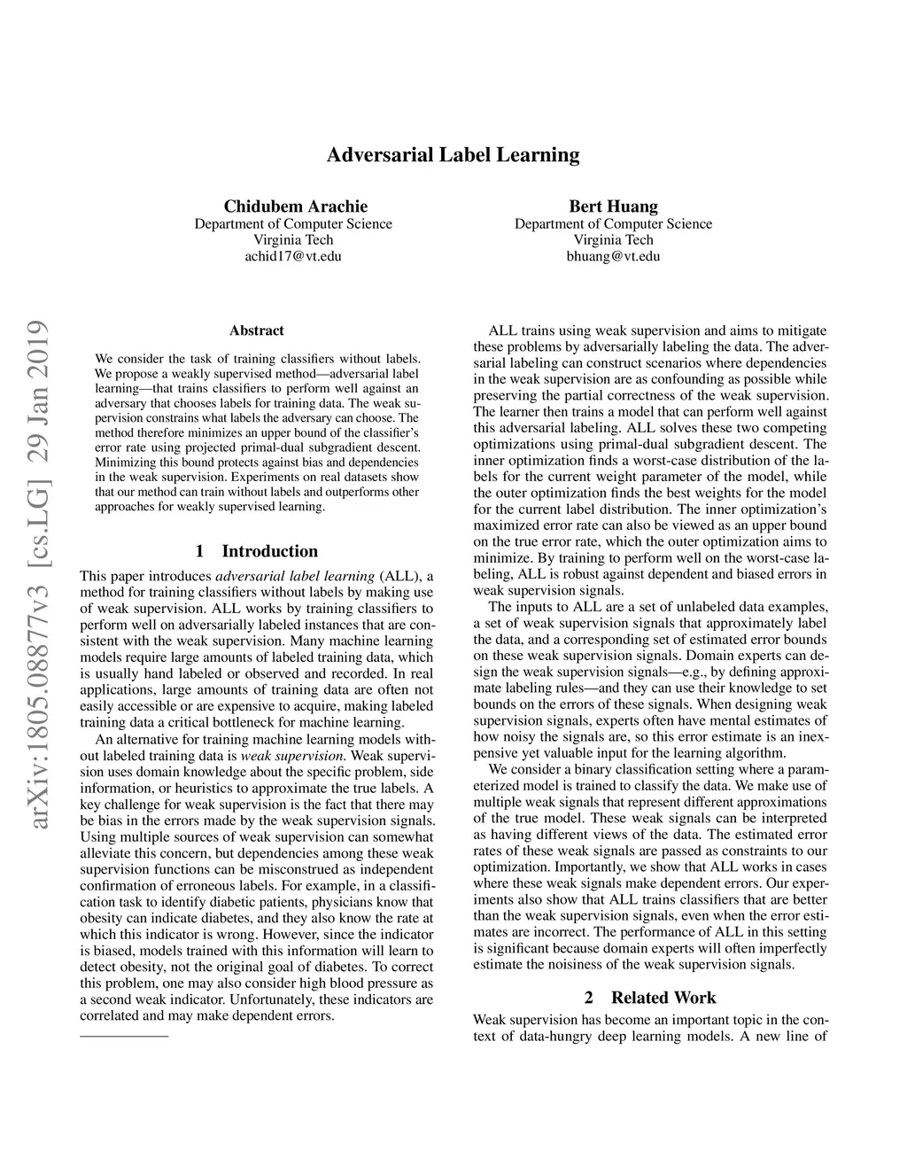 We consider the task of training classifiers without labels. We propose a weakly supervised method---adversarial label learning---that trains classifiers to perform well against an adversary that chooses labels for training data. The weak supervision constrains what labels the adversary can choose. The method therefore minimizes an upper bound of the classifier's error rate using projected primal-dual subgradient descent. Minimizing this bound protects against bias and dependencies in the weak supervision. Experiments on three real datasets show that our method can train without labels and outperforms other approaches for weakly supervised learning.