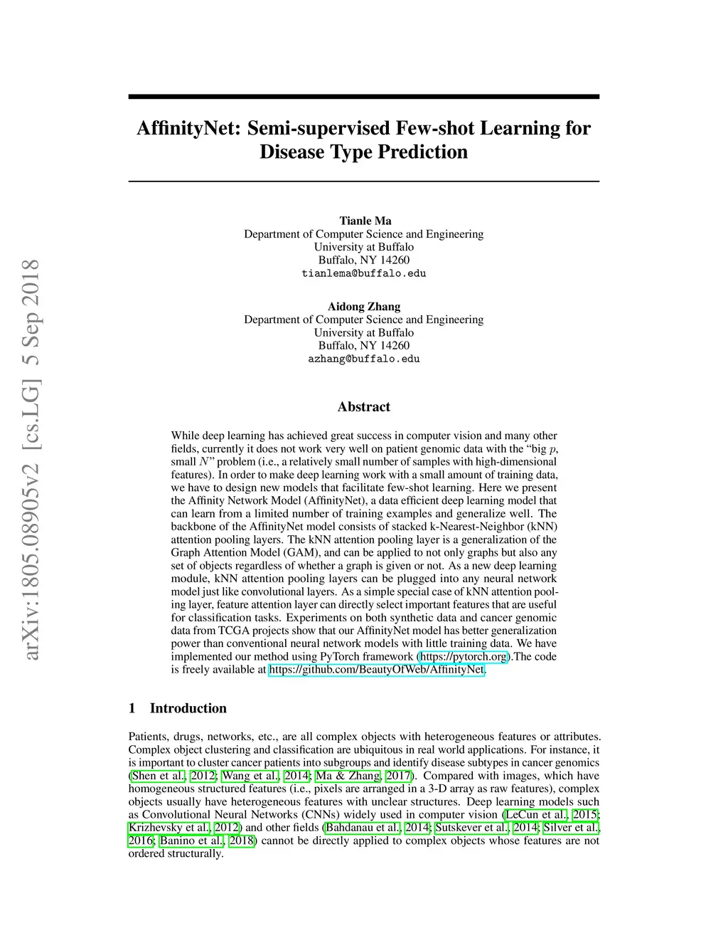 While deep learning has achieved great success in computer vision and many other fields, currently it does not work very well on patient genomic data with the "big p, small N" problem (i.e., a relatively small number of samples with high-dimensional features). In order to make deep learning work with a small amount of training data, we have to design new models that facilitate few-shot learning. Here we present the Affinity Network Model (AffinityNet), a data efficient deep learning model that can learn from a limited number of training examples and generalize well. The backbone of the AffinityNet model consists of stacked k-Nearest-Neighbor (kNN) attention pooling layers. The kNN attention pooling layer is a generalization of the Graph Attention Model (GAM), and can be applied to not only graphs but also any set of objects regardless of whether a graph is given or not. As a new deep learning module, kNN attention pooling layers can be plugged into any neural network model just like convolutional layers. As a simple special case of kNN attention pooling layer, feature attention layer can directly select important features that are useful for classification tasks. Experiments on both synthetic data and cancer genomic data from TCGA projects show that our AffinityNet model has better generalization power than conventional neural network models with little training data. The code is freely available at https://github.com/BeautyOfWeb/AffinityNet .