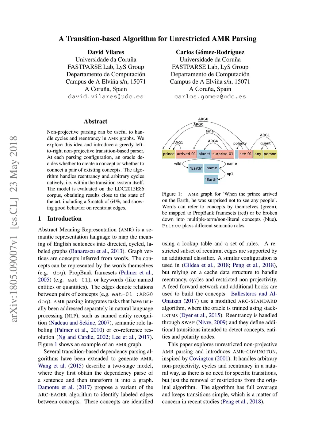 A Transition-based Algorithm for Unrestricted AMR Parsing