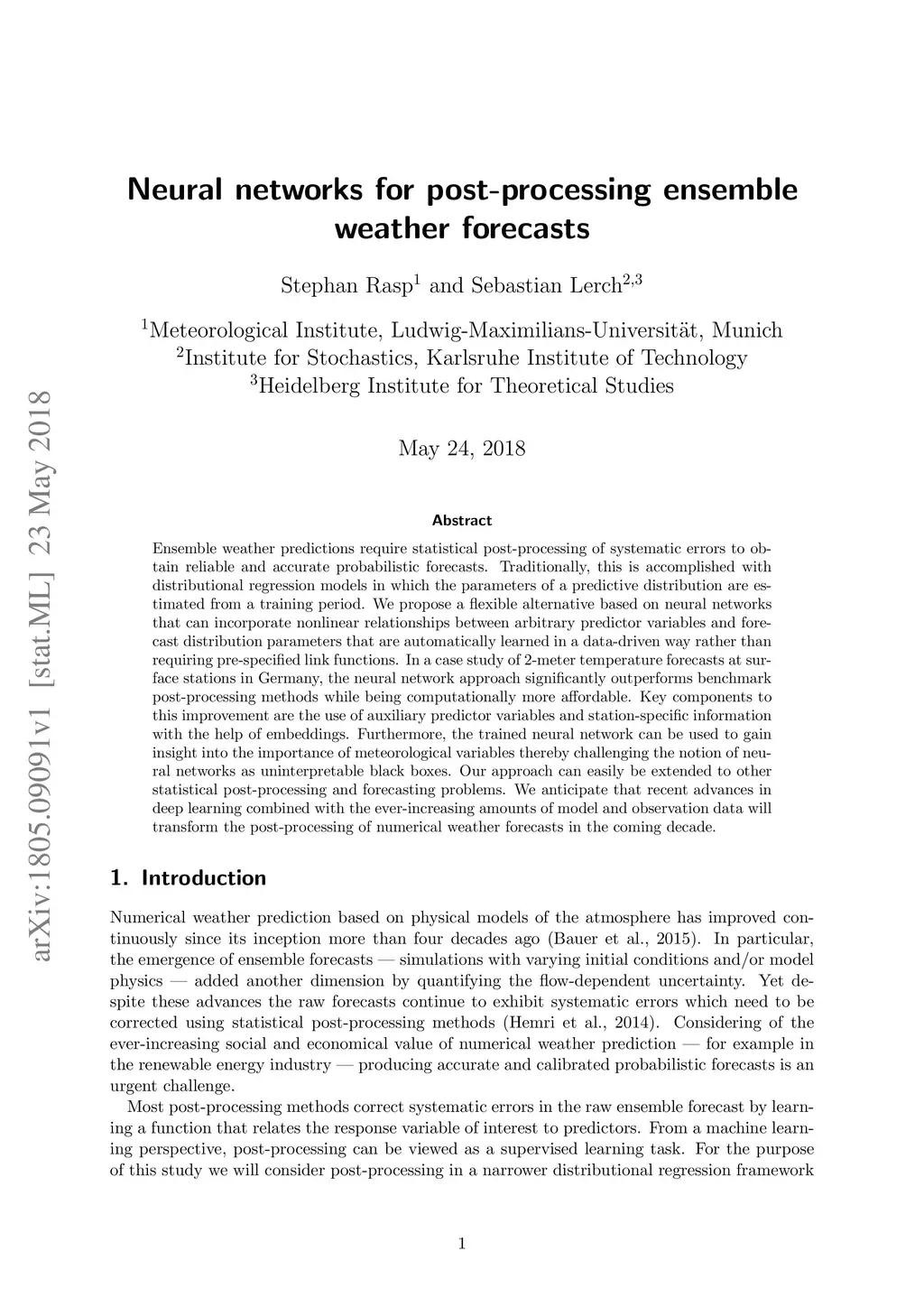 Ensemble weather predictions require statistical post-processing of systematic errors to obtain reliable and accurate probabilistic forecasts. Traditionally, this is accomplished with distributional regression models in which the parameters of a predictive distribution are estimated from a training period. We propose a flexible alternative based on neural networks that can incorporate nonlinear relationships between arbitrary predictor variables and forecast distribution parameters that are automatically learned in a data-driven way rather than requiring pre-specified link functions. In a case study of 2-meter temperature forecasts at surface stations in Germany, the neural network approach significantly outperforms benchmark post-processing methods while being computationally more affordable. Key components to this improvement are the use of auxiliary predictor variables and station-specific information with the help of embeddings. Furthermore, the trained neural network can be used to gain insight into the importance of meteorological variables thereby challenging the notion of neural networks as uninterpretable black boxes. Our approach can easily be extended to other statistical post-processing and forecasting problems. We anticipate that recent advances in deep learning combined with the ever-increasing amounts of model and observation data will transform the post-processing of numerical weather forecasts in the coming decade.