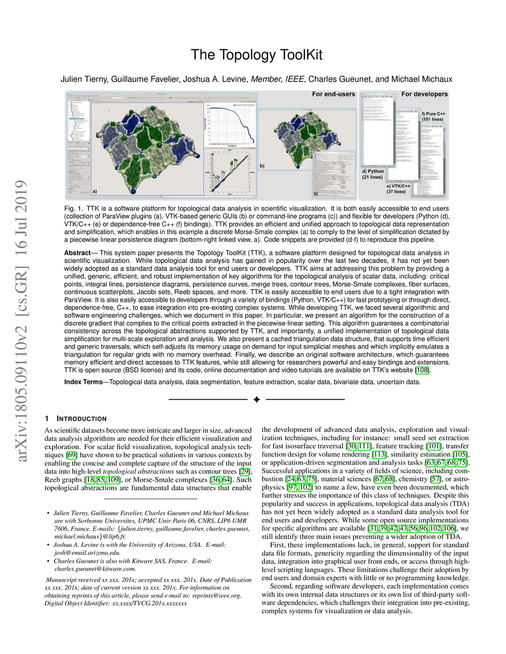 This system paper presents the Topology ToolKit (TTK), a software platform designed for topological data analysis in scientific visualization. TTK provides a unified, generic, efficient, and robust implementation of key algorithms for the topological analysis of scalar data, including: critical points, integral lines, persistence diagrams, persistence curves, merge trees, contour trees, Morse-Smale complexes, fiber surfaces, continuous scatterplots, Jacobi sets, Reeb spaces, and more. TTK is easily accessible to end users due to a tight integration with ParaView. It is also easily accessible to developers through a variety of bindings (Python, VTK/C++) for fast prototyping or through direct, dependence-free, C++, to ease integration into pre-existing complex systems. While developing TTK, we faced several algorithmic and software engineering challenges, which we document in this paper. In particular, we present an algorithm for the construction of a discrete gradient that complies to the critical points extracted in the piecewise-linear setting. This algorithm guarantees a combinatorial consistency across the topological abstractions supported by TTK, and importantly, a unified implementation of topological data simplification for multi-scale exploration and analysis. We also present a cached triangulation data structure, that supports time efficient and generic traversals, which self-adjusts its memory usage on demand for input simplicial meshes and which implicitly emulates a triangulation for regular grids with no memory overhead. Finally, we describe an original software architecture, which guarantees memory efficient and direct accesses to TTK features, while still allowing for researchers powerful and easy bindings and extensions. TTK is open source (BSD license) and its code, online documentation and video tutorials are available on TTK's website.