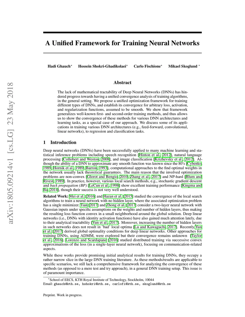 The lack of mathematical tractability of Deep Neural Networks (DNNs) has hindered progress towards having a unified convergence analysis of training algorithms, in the general setting. We propose a unified optimization framework for training different types of DNNs, and establish its convergence for arbitrary loss, activation, and regularization functions, assumed to be smooth. We show that framework generalizes well-known first- and second-order training methods, and thus allows us to show the convergence of these methods for various DNN architectures and learning tasks, as a special case of our approach. We discuss some of its applications in training various DNN architectures (e.g., feed-forward, convolutional, linear networks), to regression and classification tasks.