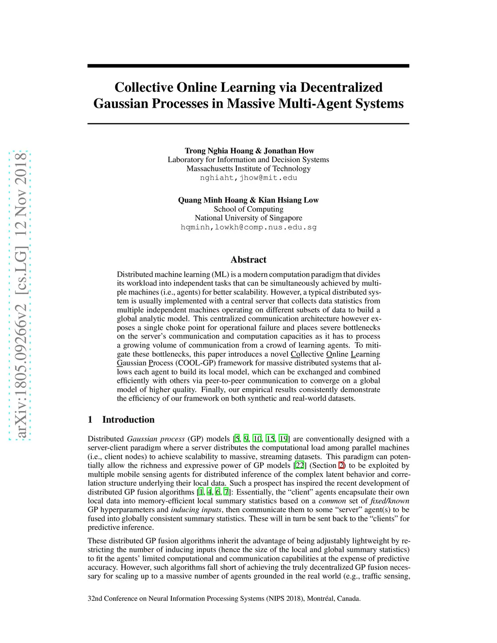 Distributed machine learning (ML) is a modern computation paradigm that divides its workload into independent tasks that can be simultaneously achieved by multiple machines (i.e., agents) for better scalability. However, a typical distributed system is usually implemented with a central server that collects data statistics from multiple independent machines operating on different subsets of data to build a global analytic model. This centralized communication architecture however exposes a single choke point for operational failure and places severe bottlenecks on the server's communication and computation capacities as it has to process a growing volume of communication from a crowd of learning agents. To mitigate these bottlenecks, this paper introduces a novel Collective Online Learning Gaussian Process framework for massive distributed systems that allows each agent to build its local model, which can be exchanged and combined efficiently with others via peer-to-peer communication to converge on a global model of higher quality. Finally, our empirical results consistently demonstrate the efficiency of our framework on both synthetic and real-world datasets.