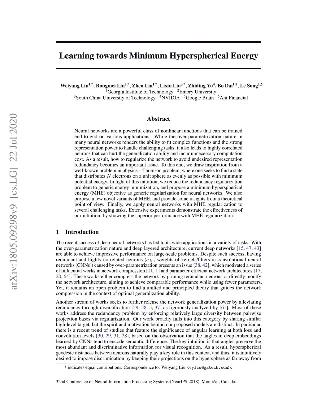 Neural networks are a powerful class of nonlinear functions that can be trained end-to-end on various applications. While the over-parametrization nature in many neural networks renders the ability to fit complex functions and the strong representation power to handle challenging tasks, it also leads to highly correlated neurons that can hurt the generalization ability and incur unnecessary computation cost. As a result, how to regularize the network to avoid undesired representation redundancy becomes an important issue. To this end, we draw inspiration from a well-known problem in physics -- Thomson problem, where one seeks to find a state that distributes N electrons on a unit sphere as evenly as possible with minimum potential energy. In light of this intuition, we reduce the redundancy regularization problem to generic energy minimization, and propose a minimum hyperspherical energy (MHE) objective as generic regularization for neural networks. We also propose a few novel variants of MHE, and provide some insights from a theoretical point of view. Finally, we apply neural networks with MHE regularization to several challenging tasks. Extensive experiments demonstrate the effectiveness of our intuition, by showing the superior performance with MHE regularization.