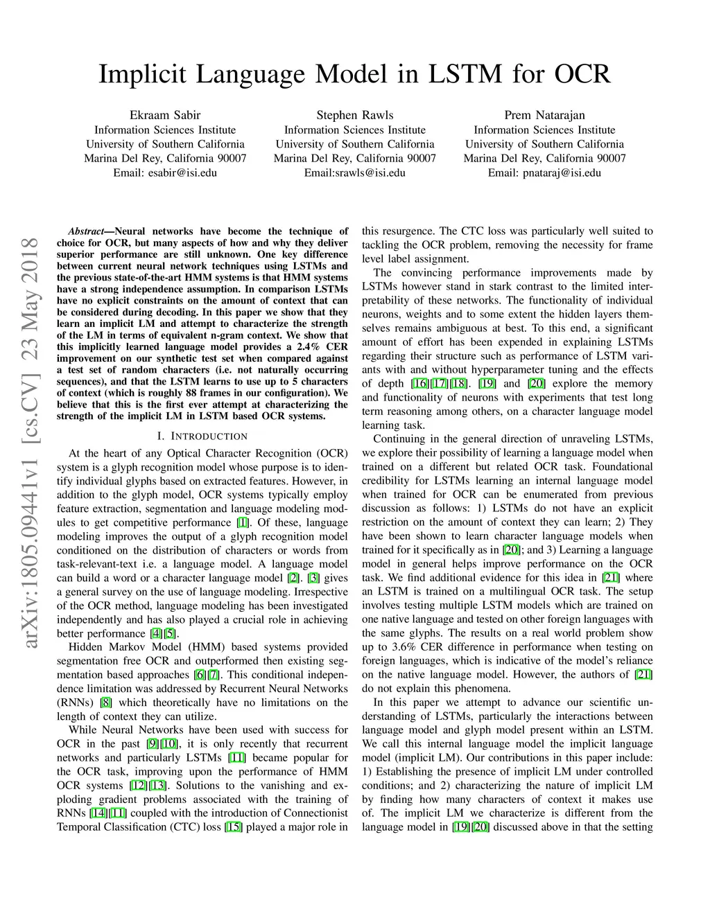 Neural networks have become the technique of choice for OCR, but many aspects of how and why they deliver superior performance are still unknown. One key difference between current neural network techniques using LSTMs and the previous state-of-the-art HMM systems is that HMM systems have a strong independence assumption. In comparison LSTMs have no explicit constraints on the amount of context that can be considered during decoding. In this paper we show that they learn an implicit LM and attempt to characterize the strength of the LM in terms of equivalent n-gram context. We show that this implicitly learned language model provides a 2.4\% CER improvement on our synthetic test set when compared against a test set of random characters (i.e. not naturally occurring sequences), and that the LSTM learns to use up to 5 characters of context (which is roughly 88 frames in our configuration). We believe that this is the first ever attempt at characterizing the strength of the implicit LM in LSTM based OCR systems.