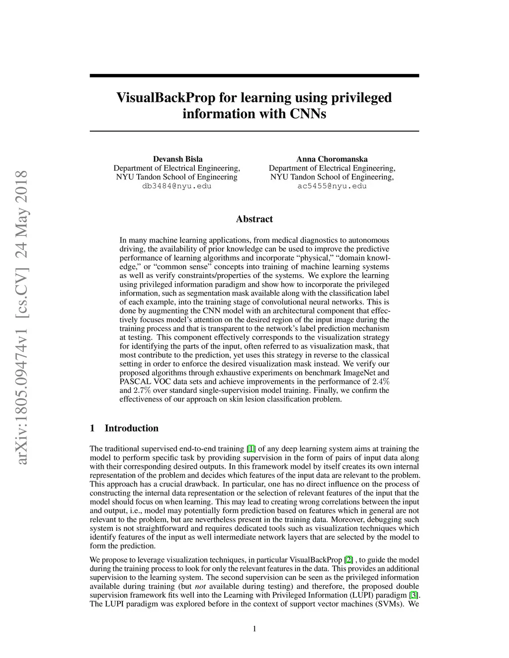 In many machine learning applications, from medical diagnostics to autonomous driving, the availability of prior knowledge can be used to improve the predictive performance of learning algorithms and incorporate `physical,' `domain knowledge,' or `common sense' concepts into training of machine learning systems as well as verify constraints/properties of the systems. We explore the learning using privileged information paradigm and show how to incorporate the privileged information, such as segmentation mask available along with the classification label of each example, into the training stage of convolutional neural networks. This is done by augmenting the CNN model with an architectural component that effectively focuses model's attention on the desired region of the input image during the training process and that is transparent to the network's label prediction mechanism at testing. This component effectively corresponds to the visualization strategy for identifying the parts of the input, often referred to as visualization mask, that most contribute to the prediction, yet uses this strategy in reverse to the classical setting in order to enforce the desired visualization mask instead. We verify our proposed algorithms through exhaustive experiments on benchmark ImageNet and PASCAL VOC data sets and achieve improvements in the performance of and over standard single-supervision model training. Finally, we confirm the effectiveness of our approach on skin lesion classification problem.