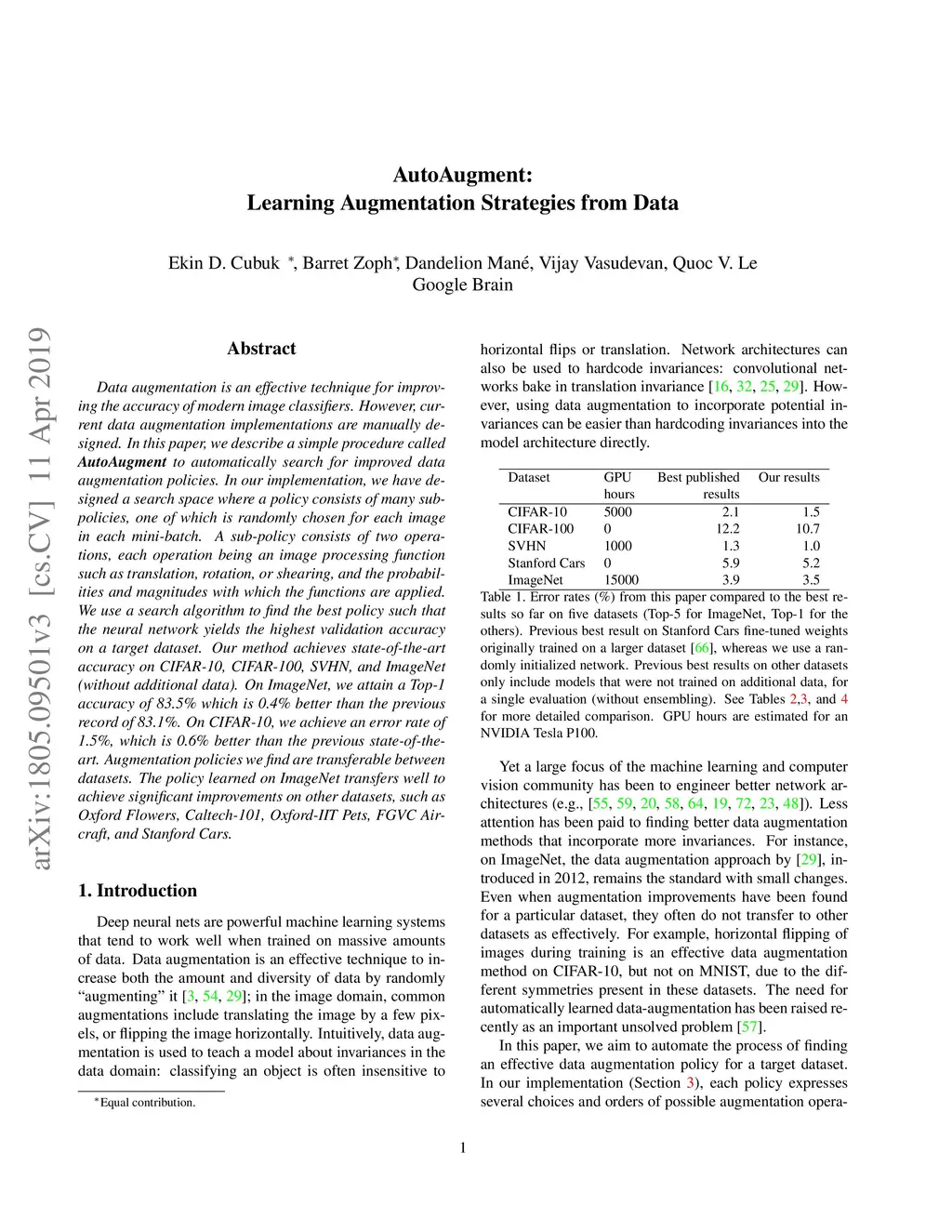 Data augmentation is an effective technique for improving the accuracy of modern image classifiers. However, current data augmentation implementations are manually designed. In this paper, we describe a simple procedure called AutoAugment to automatically search for improved data augmentation policies. In our implementation, we have designed a search space where a policy consists of many sub-policies, one of which is randomly chosen for each image in each mini-batch. A sub-policy consists of two operations, each operation being an image processing function such as translation, rotation, or shearing, and the probabilities and magnitudes with which the functions are applied. We use a search algorithm to find the best policy such that the neural network yields the highest validation accuracy on a target dataset. Our method achieves state-of-the-art accuracy on CIFAR-10, CIFAR-100, SVHN, and ImageNet (without additional data). On ImageNet, we attain a Top-1 accuracy of 83.5% which is 0.4% better than the previous record of 83.1%. On CIFAR-10, we achieve an error rate of 1.5%, which is 0.6% better than the previous state-of-the-art. Augmentation policies we find are transferable between datasets. The policy learned on ImageNet transfers well to achieve significant improvements on other datasets, such as Oxford Flowers, Caltech-101, Oxford-IIT Pets, FGVC Aircraft, and Stanford Cars.