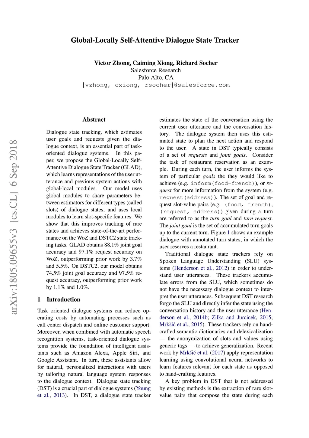 Dialogue state tracking, which estimates user goals and requests given the dialogue context, is an essential part of task-oriented dialogue systems. In this paper, we propose the Global-Locally Self-Attentive Dialogue State Tracker (GLAD), which learns representations of the user utterance and previous system actions with global-local modules. Our model uses global modules to share parameters between estimators for different types (called slots) of dialogue states, and uses local modules to learn slot-specific features. We show that this significantly improves tracking of rare states and achieves state-of-the-art performance on the WoZ and DSTC2 state tracking tasks. GLAD obtains 88.1% joint goal accuracy and 97.1% request accuracy on WoZ, outperforming prior work by 3.7% and 5.5%. On DSTC2, our model obtains 74.5% joint goal accuracy and 97.5% request accuracy, outperforming prior work by 1.1% and 1.0%.
