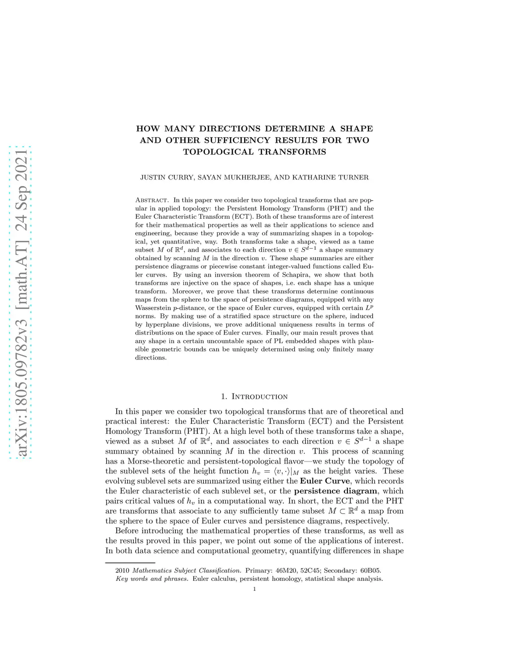 In this paper we consider two topological transforms that are popular in applied topology: the Persistent Homology Transform (PHT) and the Euler Characteristic Transform (ECT). Both of these transforms are of interest for their mathematical properties as well as their applications to science and engineering, because they provide a way of summarizing shapes in a topological, yet quantitative, way. Both transforms take a shape, viewed as a tame subset of , and associates to each direction a shape summary obtained by scanning in the direction . These shape summaries are either persistence diagrams or piecewise constant integer-valued functions called Euler curves. By using an inversion theorem of Schapira, we show that both transforms are injective on the space of shapes, i.e.~each shape has a unique transform. Moreover, we prove that these transforms determine continuous maps from the sphere to the space of persistence diagrams, equipped with any Wasserstein -distance, or the space of Euler curves, equipped with certain norms. By making use of a stratified space structure on the sphere, induced by hyperplane divisions, we prove additional uniqueness results in terms of distributions on the space of Euler curves. Finally, our main result proves that any shape in a certain uncountable space of PL embedded shapes with plausible geometric bounds can be uniquely determined using only finitely many directions.