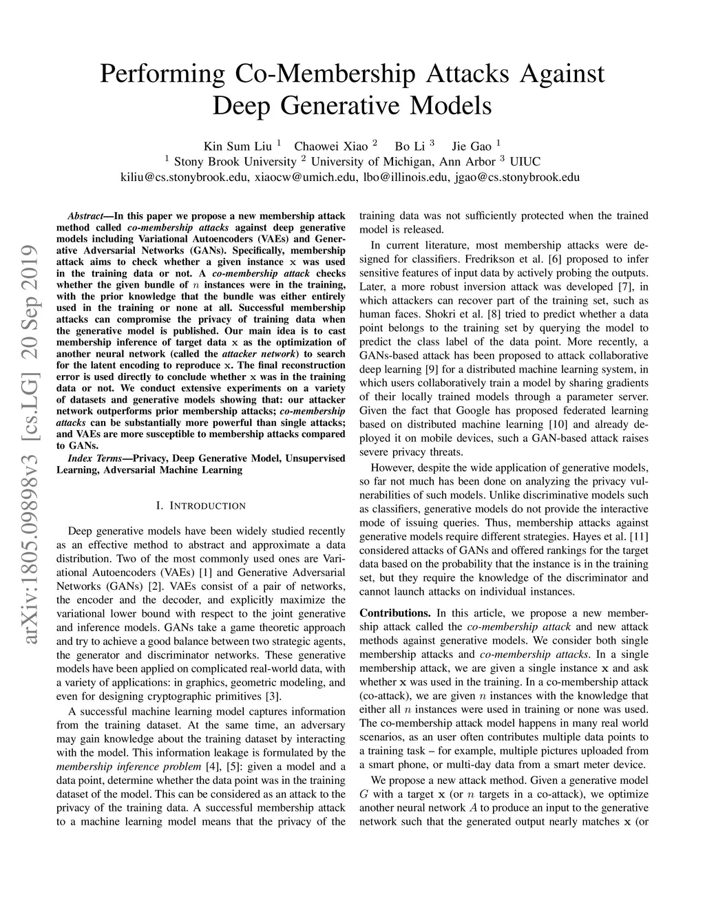 In this paper we propose a new membership attack method called co-membership attacks against deep generative models including Variational Autoencoders (VAEs) and Generative Adversarial Networks (GANs). Specifically, membership attack aims to check whether a given instance x was used in the training data or not. A co-membership attack checks whether the given bundle of n instances were in the training, with the prior knowledge that the bundle was either entirely used in the training or none at all. Successful membership attacks can compromise the privacy of training data when the generative model is published. Our main idea is to cast membership inference of target data x as the optimization of another neural network (called the attacker network) to search for the latent encoding to reproduce x. The final reconstruction error is used directly to conclude whether x was in the training data or not. We conduct extensive experiments on a variety of datasets and generative models showing that: our attacker network outperforms prior membership attacks; co-membership attacks can be substantially more powerful than single attacks; and VAEs are more susceptible to membership attacks compared to GANs.