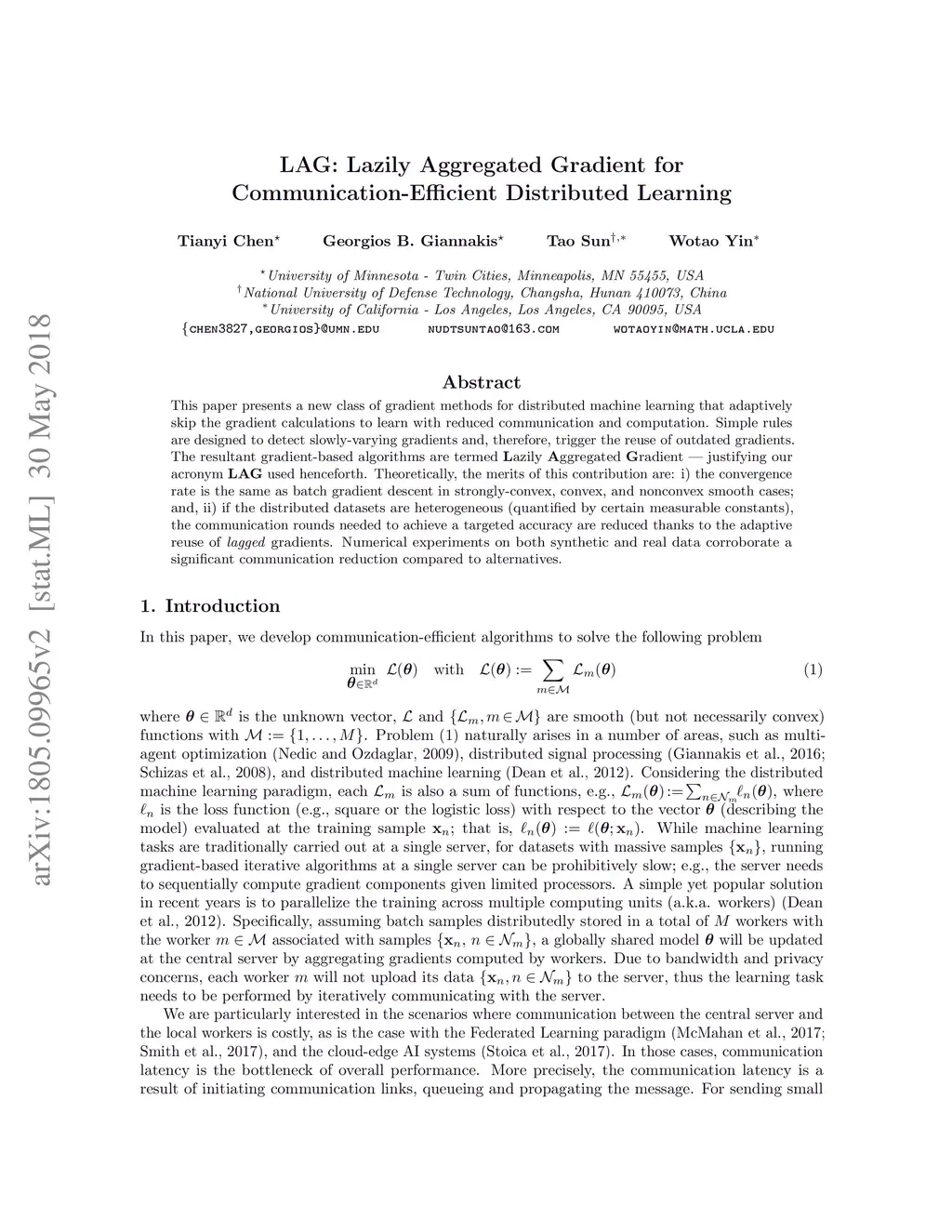 LAG: Lazily Aggregated Gradient for Communication-Efficient Distributed